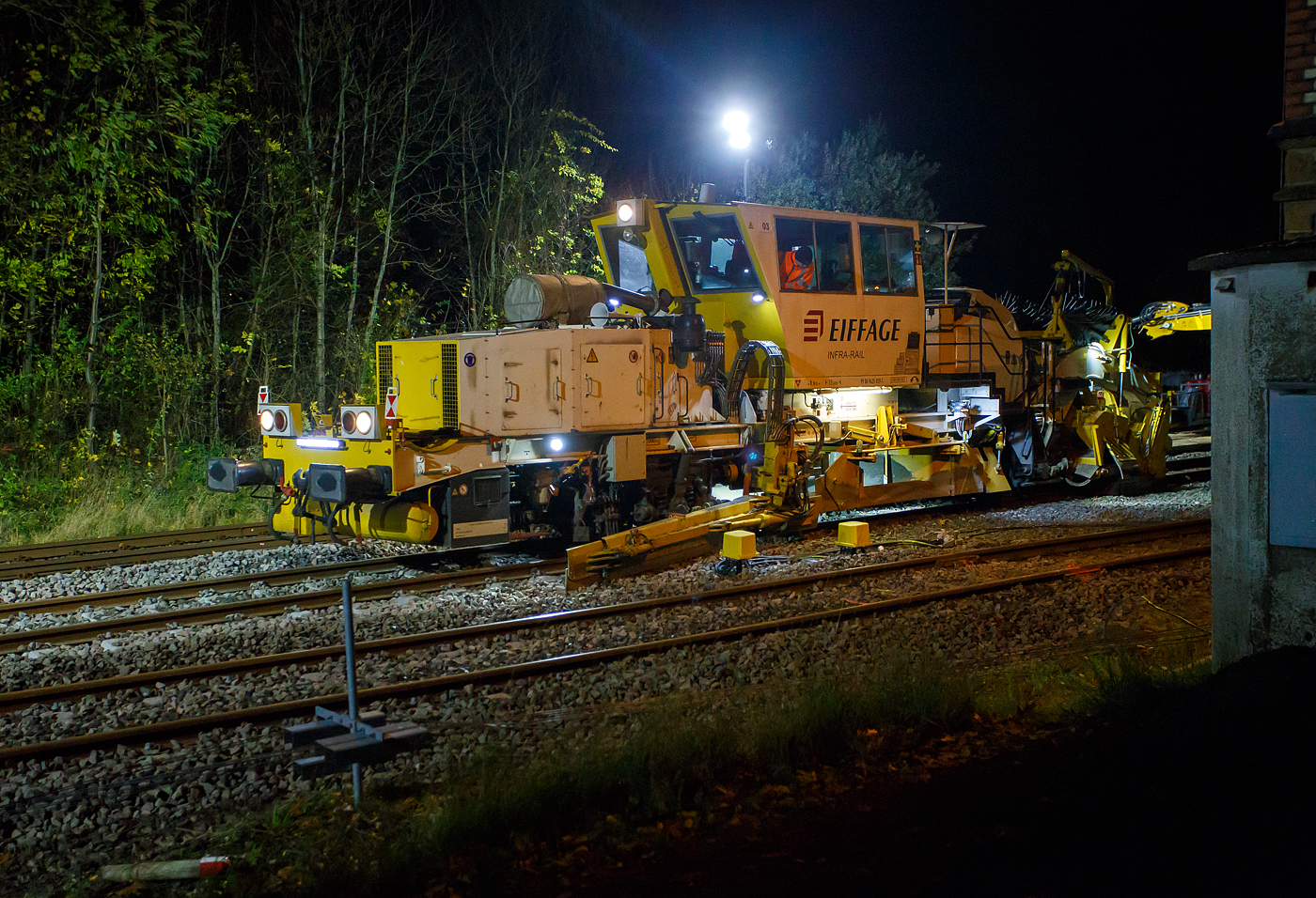 Die Baustelle Bahnhof Herdorf am Abend des 26 Oktober 2025 (ab 21:10 Uhr). Nach jedem Stopfdurchgang, wie hier von der P & T UNIMAT 09-4x4/4S E³ (eine Nivelier-, Hebe-, Richt- und Universalstopfmaschine), der neuen Weiche 3 folgt eine Schotterplaniermaschine. So ist es hier die Schnell-Schotterplaniermaschine SSP 110 SW, D-ERB 99 80 9425 039-1 der Eiffage Infra-Rail GmbH (Herne), ex 97 16 40 546 17-4 der Heitkamp GmbH Herne (später Eiffage Rail), im Einsatz.