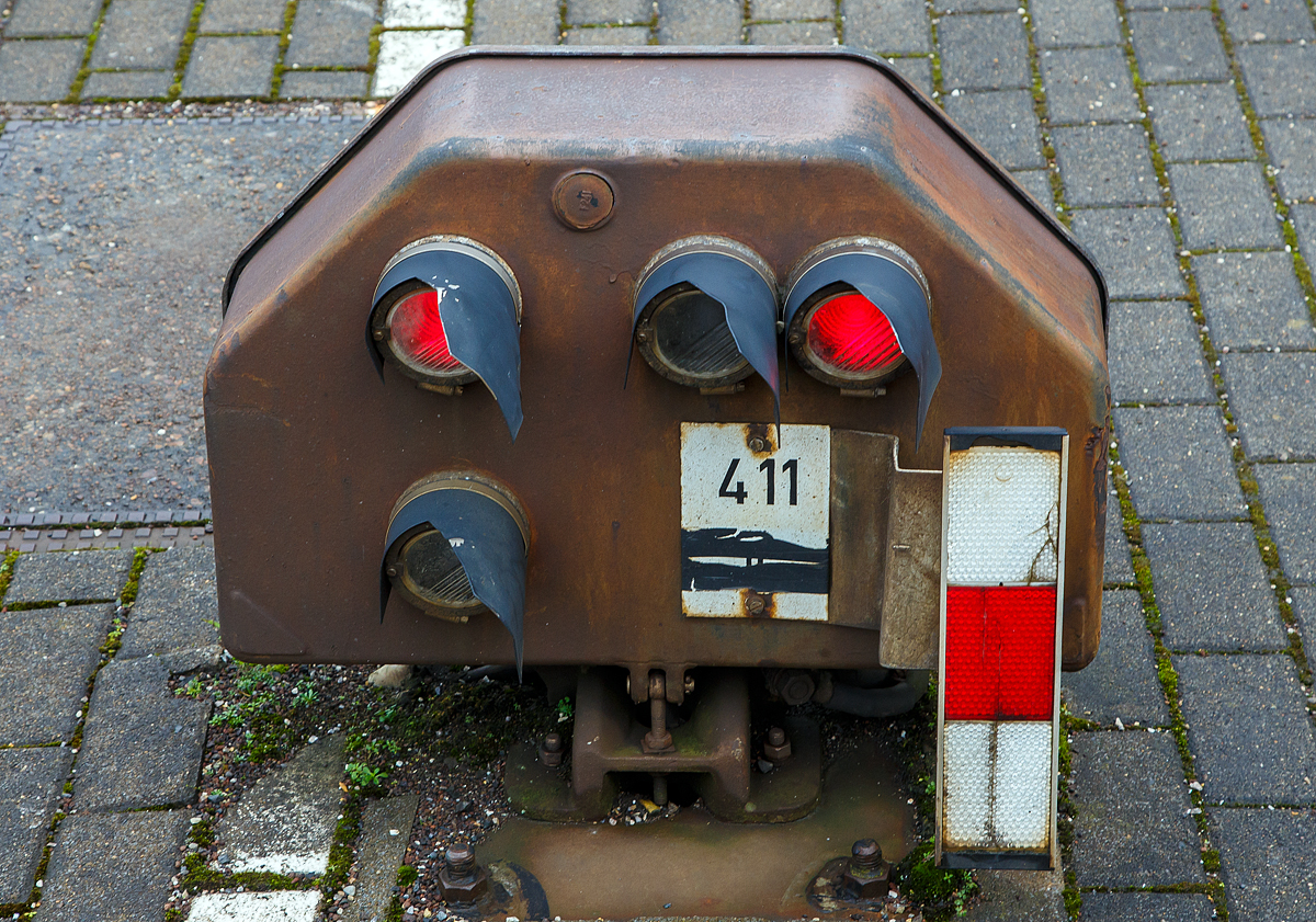 Schutzsignal - Signal Hp 0 „Halt“ an einem niedrigstehenden Lichtsperrsignal (Schotterzwerg), beim Bahnhof Scheuerfeld (Sieg), Gleis 411 (Fahrtrichtung Betzdorf), kurz vor dem Bahnübergang Bü Km 79,720, hier am 18.01.2022. Diese Zwergsignale werden auch gerne "Schotterzwerg" genannt.
