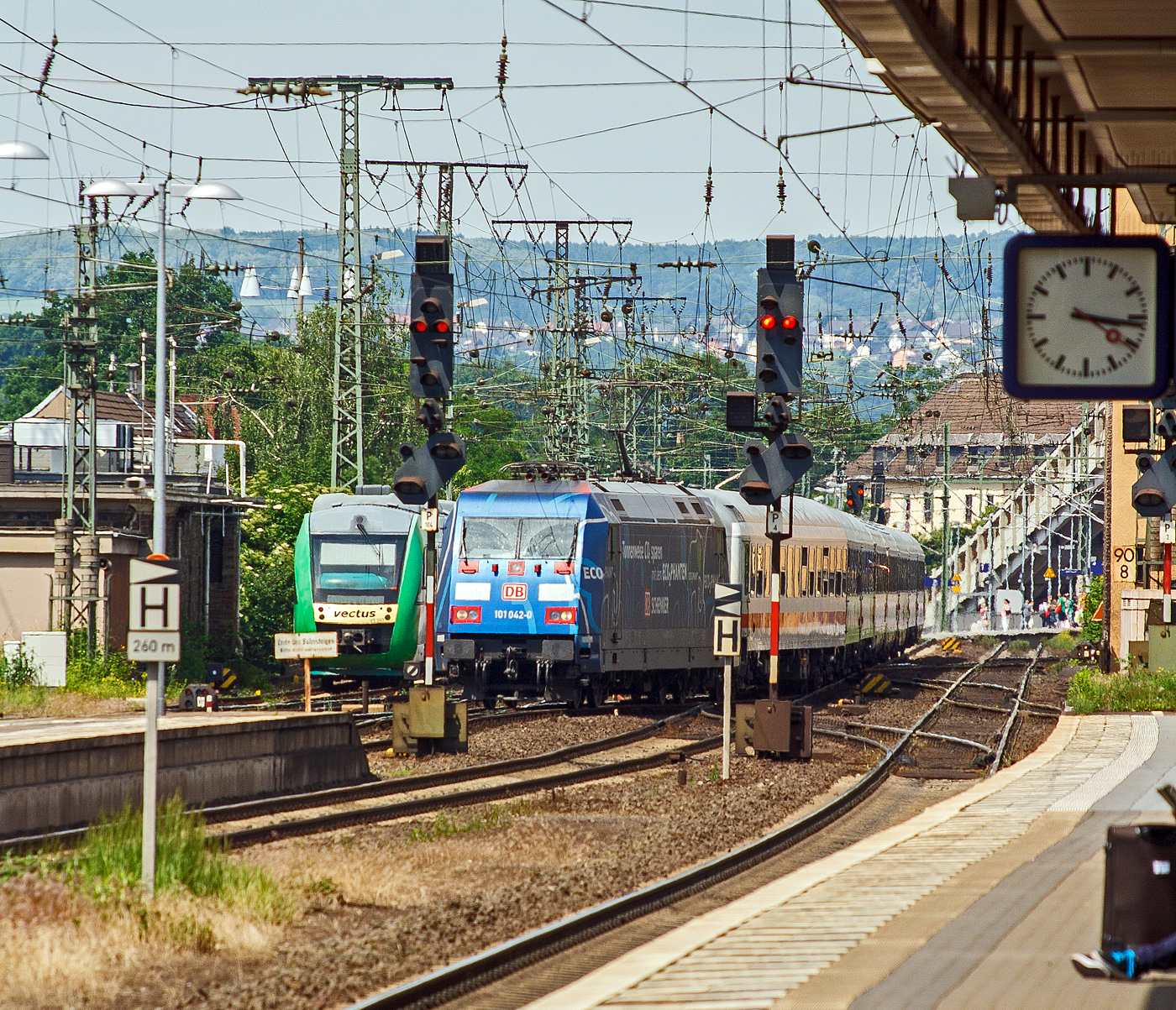 Die 101 087-5  DERTOUR - Packendes Südafrika  (91 80 60 101 087-5 D-DB) mit dem IC 2004  Bodensee  Konstanz - Koblenz – Köln - Münster - Emden Hbf, steht am 17 Juni 2013 an Gleis 3 im Hauptbahnhof Koblenz.