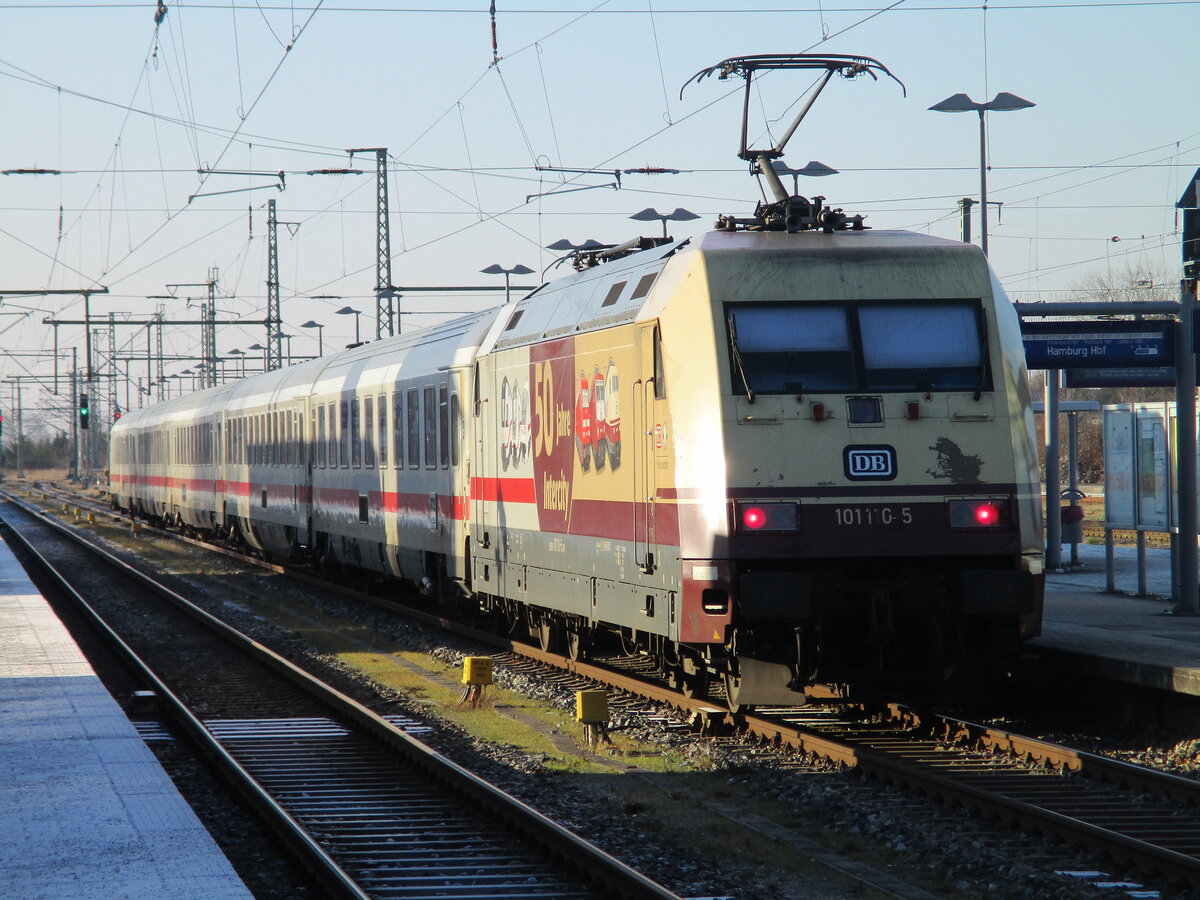 Einfahrt von 101 142-8 mit dem IC 2213 Binz-Stuttgart,am 05.Januar 2017,in Bergen/Rügen.