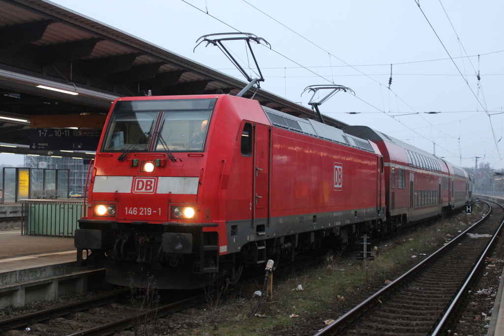 146 275 mit RE 5 von Rostock Hbf nach Berlin-Südkreuz kurz vor der Ausfahrt im Rostocker Hbf.23.01.2026
