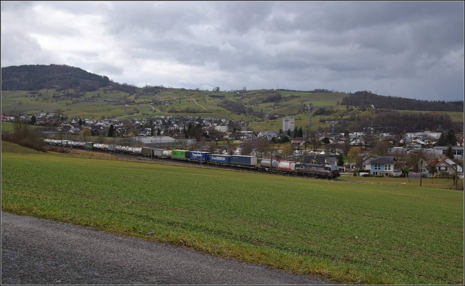 Ganz nebenbei bringt noch 193 464 'Arth Goldau' einen Güterzug durch Niederbipp Richtung Oensingen. Die Ortsdurchfahrt ist durchaus beengt und ein Dreischienengleis (im Vordergrund) ist notwendig. Februar 2026.
