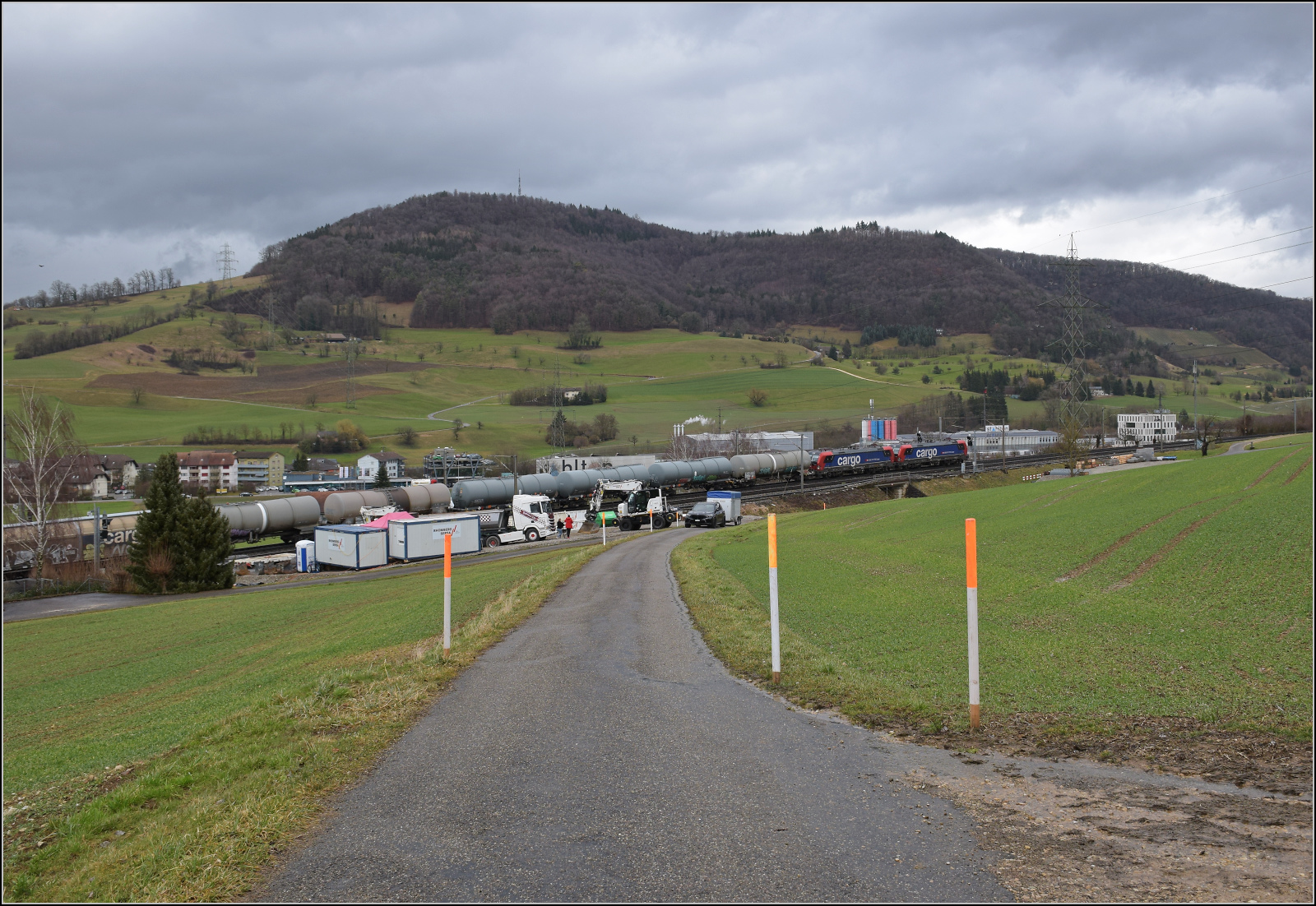 193 068 und 193 052 ziehen für SBB Cargo einen Kesselwagenzug den Bözberg hoch. Auf der temporär eingerichteten Bereitstellungsfläche für eine Bahnbaustelle war schon länger eine LKW-Fahrerin zu gange. Sie hatte sich offenbar festgefahren. Die über das Feld gelegte Schotterfläche war wohl zu steil angelegt und nicht genug verdichtet. Februar 2026.
