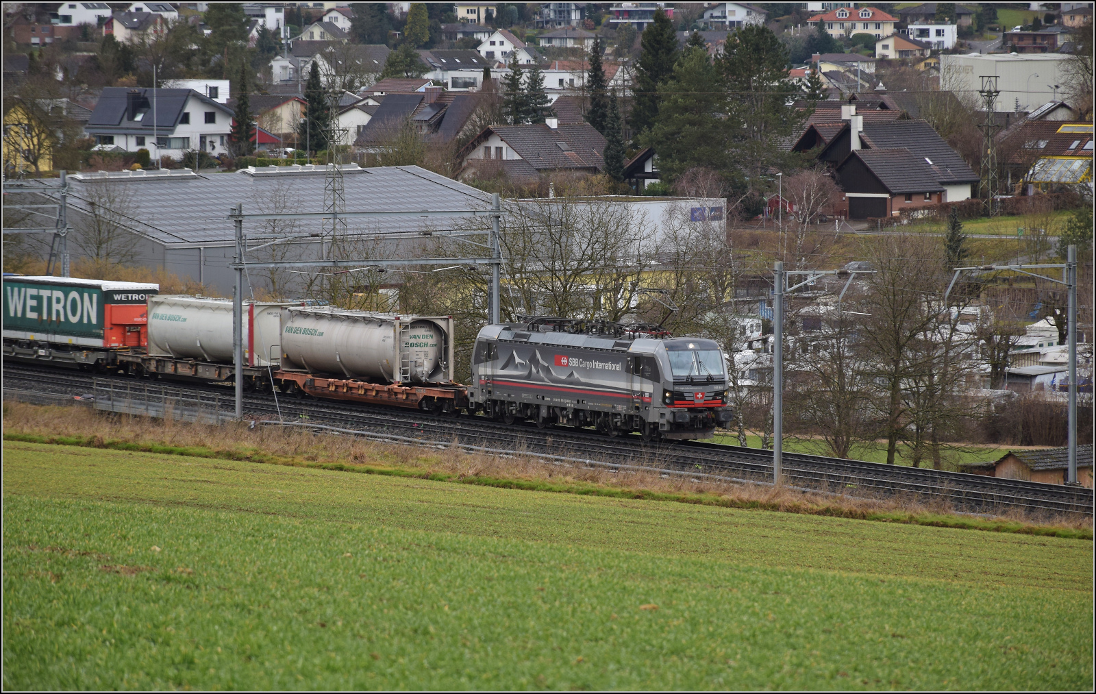 193 549 'Duomo Milano' zieht für SBBCI Auflieger, Container und Tanktainer den Bözberg hoch. Februar 2026.