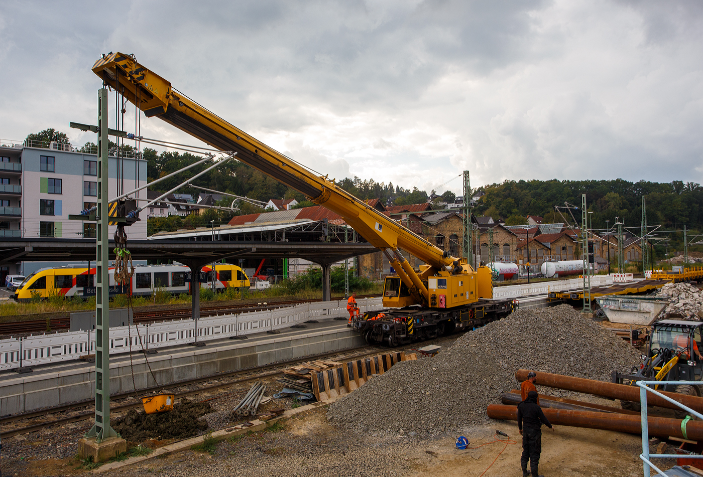 Der 125t - KIROW Gleisbauschienenkran KRC 810 T der Hering Bau (Burbach), Schweres Nebenfahrzeug Nr. D-HGUI 99 80 9419 010-0, hier mit dem Schutzwagen D-HGUI 33 80 3998 213-1 (der Gattung Res 072-1) und hinten noch mit einem weiteren Schutz- bzw. Gegenlastwagen der Gattung Res.