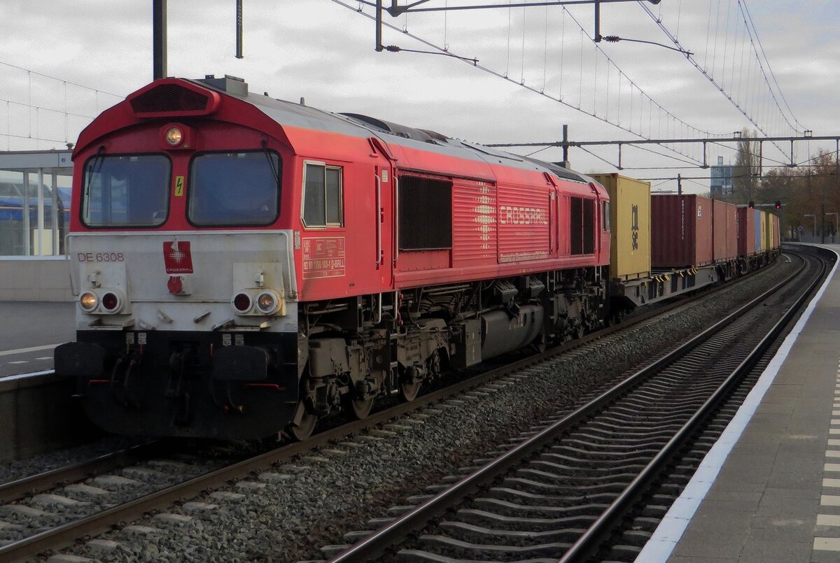 Am leicht nebligen 27 November 2020 durchfahrt Crossrail Benelux DE 6308 mit der Neuss-Antwerpen Containerzug Blerick.