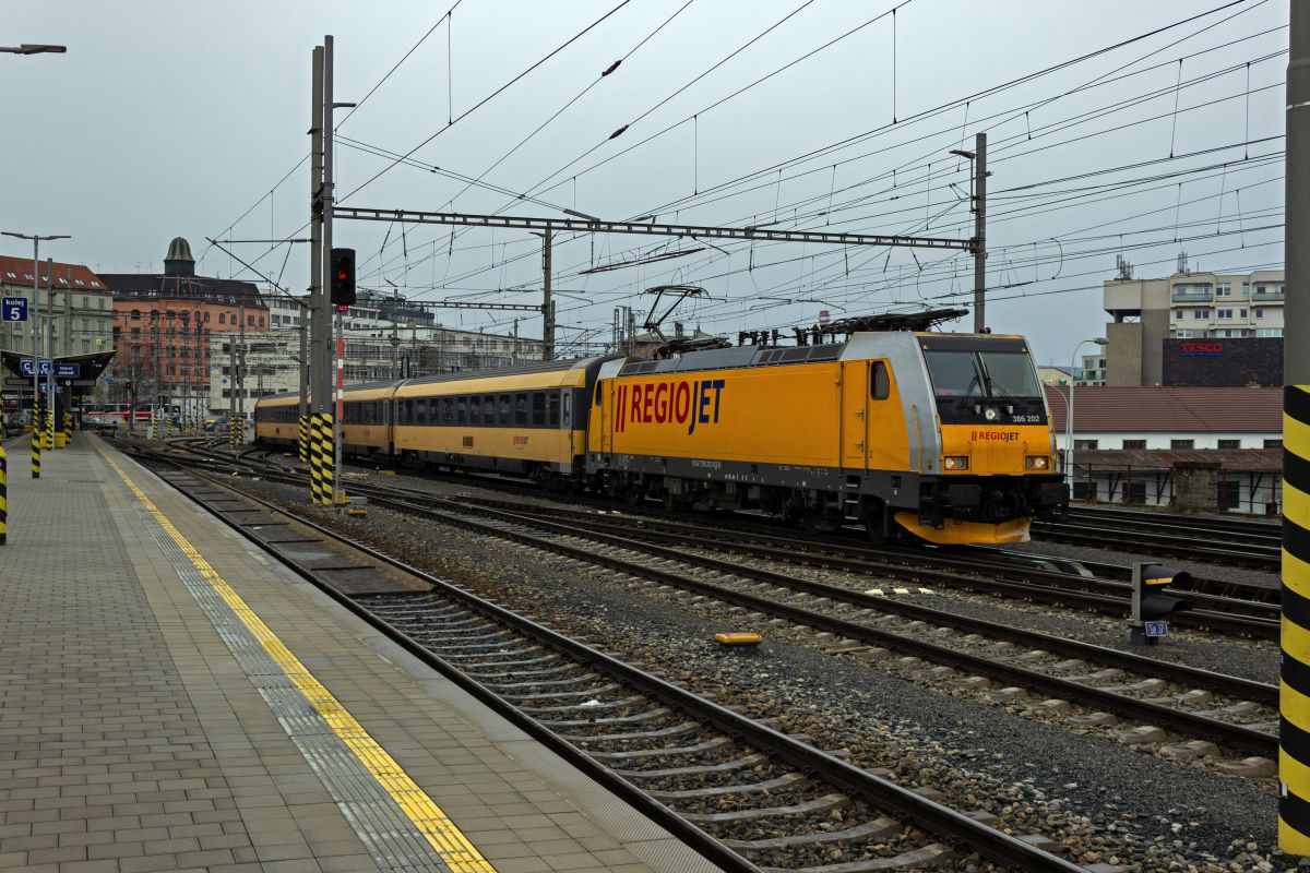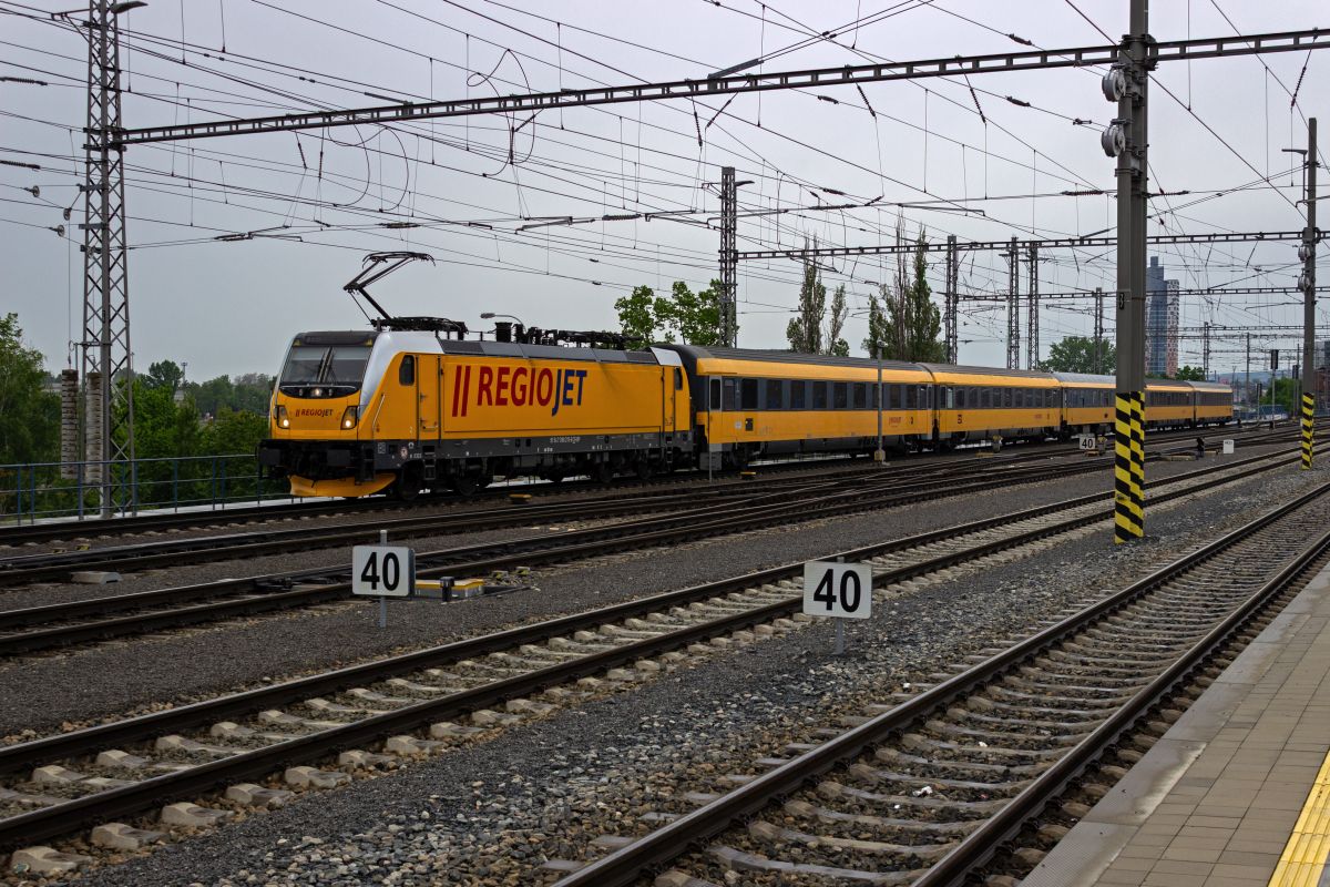 RegioJet bedient mittlerweile ein ausgedehntes Streckennetz und fährt von Prag aus unter anderem bis Ko¨ice, Bratislava und Wien. In die österreichische Hauptstadt ist 193 227 mit RJ 1037 unterwegs.