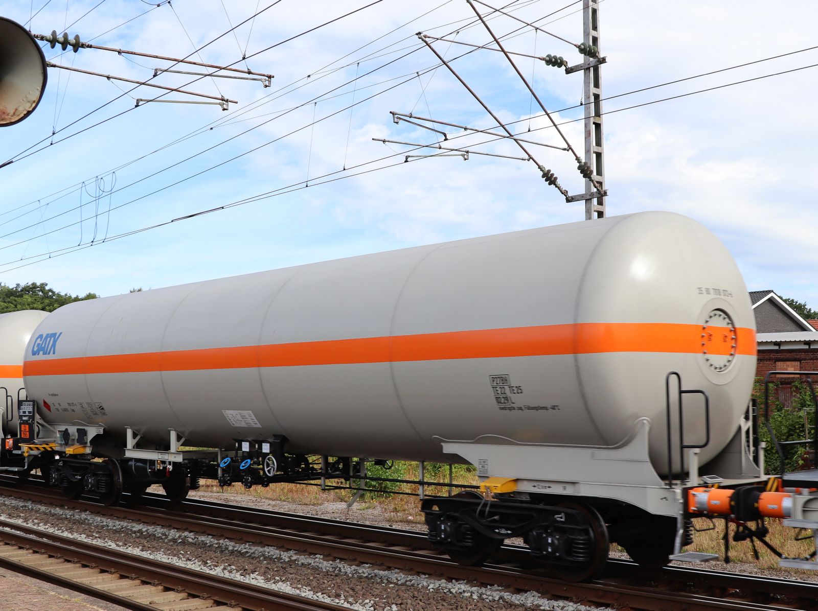 Zagns Drehgestell-Kesselwagen mit Nummer 37 TEN 80 D-WASCO 7809 117-0 von Wascosa für den Transport von Schwefeldioxid. Aufschrift " Grillo" Güterbahnhof Oberhausen West 12-03-2020.