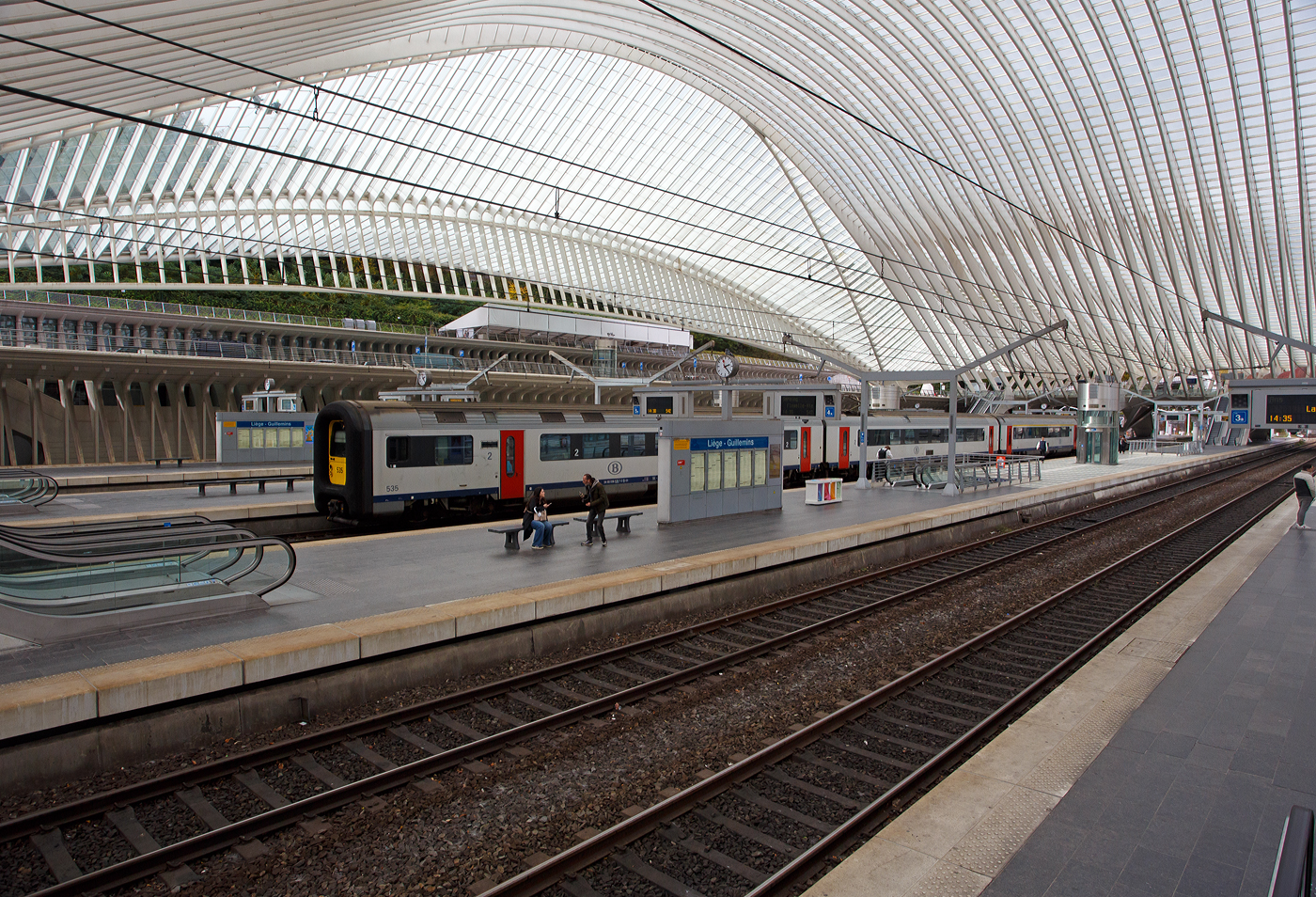 Zwei Triebzüge am 21 Oktober 2025 im Bahnhof Liège-Guillemins (Lüttich-Guillemins) nebeneinander. Vorne der Siemens Desiro ML SNCB/NMBS Triebzug AM 08551 (AM = Automotrice), als L-train (Lokalzug/Regionalzug) über Angleur (Stadtteil von Lüttich) nach Bomal. Dahinter ein langen M7 TWINDEXX-Triebwagen-Zug, als IC über Brüssel Flughafen, Gent und Brügge, an die Küste nach Knokke.