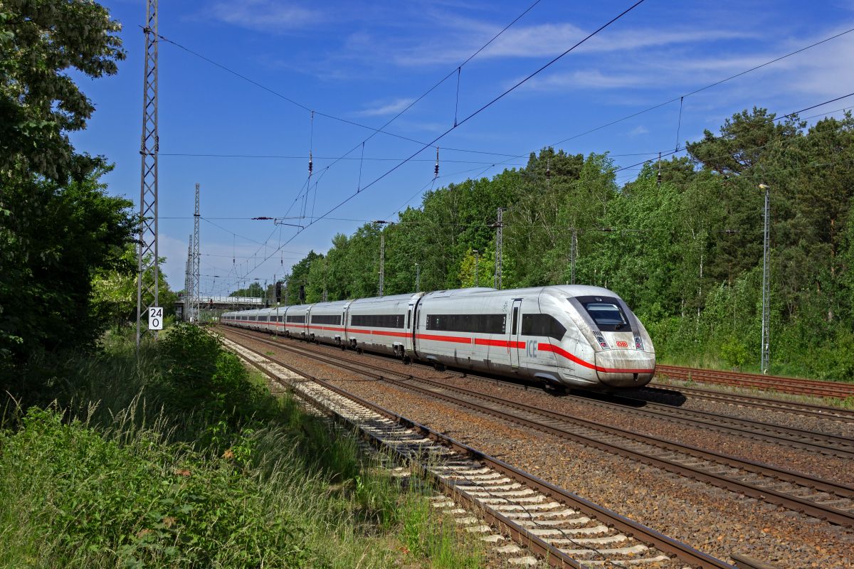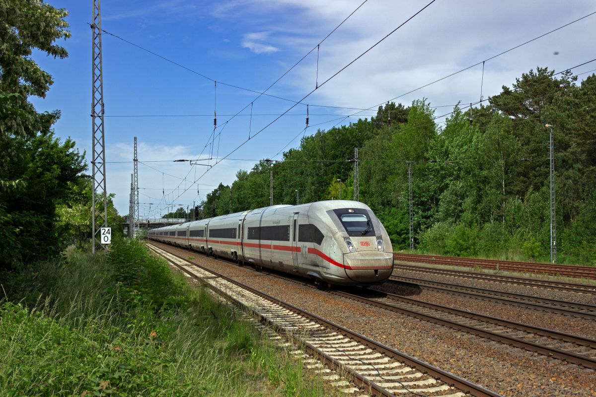 Am Zugschluss eines ICE nach Berlin ist dieser nicht identifizierte siebenteilige ICE4 kurz vor dem Halt in Bielefeld unterwegs.