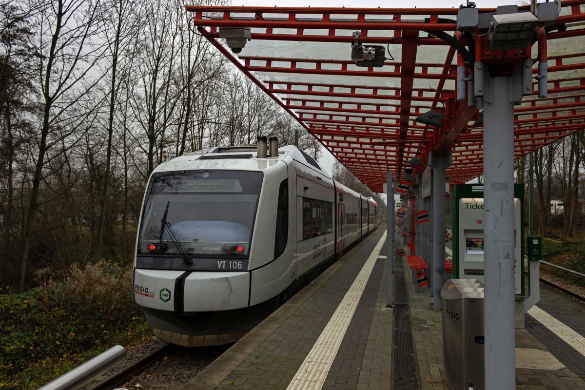 Während 609 112 durch Wuppertal-Sonnborn rollt, stellt oben auf der Brücke ein Citaro K der WSW die einzige ÖPNV-Anbindung der Station abseits der Schiene her. Die Quartierbuslinie 629 soll nach dem Willen der WSW allerdings auf Taxibus-Bertrieb umgestellt werden.