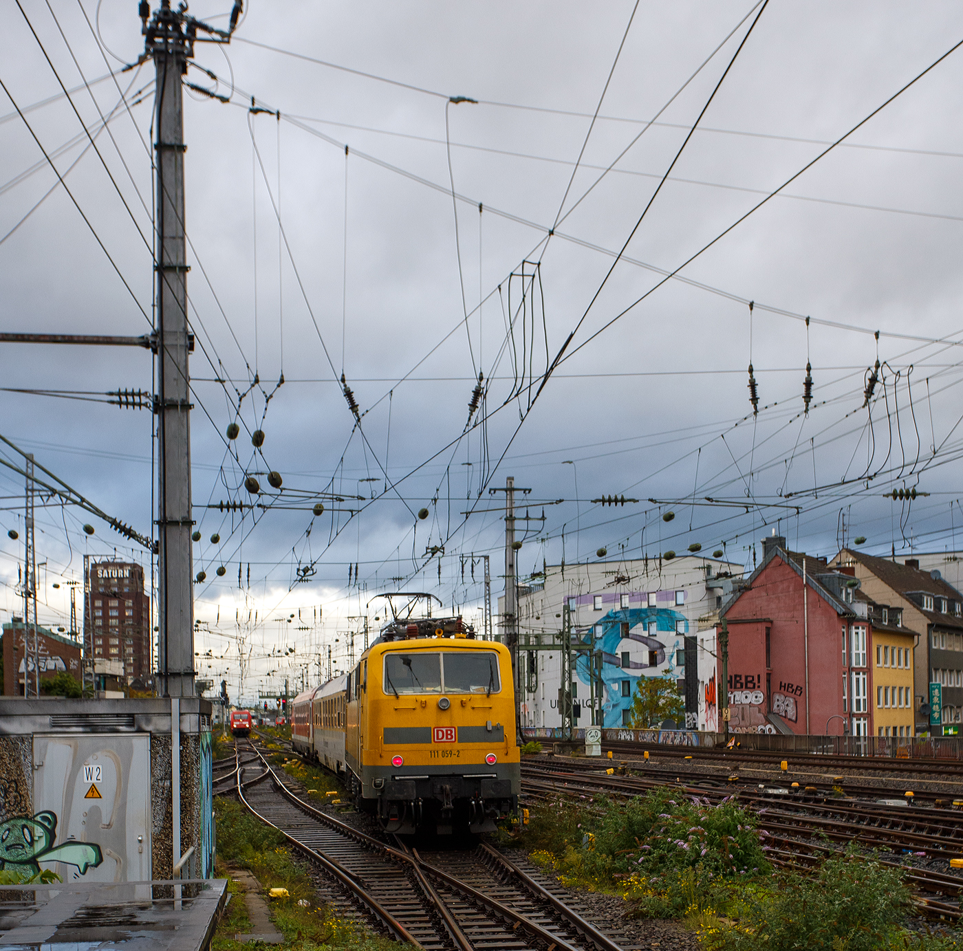 Nun schiebt die 111 059-2 (91 80 6111 059-2 D-DBMP) der DB InfraGO AG, ex DB Netz AG / DB Netz Instandhaltung – Fahrwegmessung am 21 Oktober 2025, den Messzug der DB Systemtechnik GmbH (Minden/Westf.), vom Hauptbahnhof Köln in Richtung Hansaring. Der Zug bestand aus dem Einheitsmesswagen D-DB 63 80 99-92 007-3 Dienstüm 313 und dem Steuerwagen D-DB 73 80 80-91 310-1 Bpmbdzf 296.3.