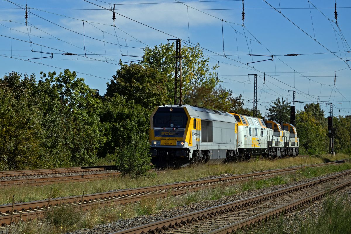 Ein Lokzug der Firma Schienen-Güter-Logistik überraschte mich am 24.09.25 in Saarmund. Geschleppt von einer Voith Maxima (92 80 1264 010-0 D-SGL) wurden eine DB-221 (92 80 1221 121-7 D-SGL) und zwei Gravita (92 80 1261 308-1 D-SGL und 92 80 1261 314-9 D-SGL). Leon Rosendahl