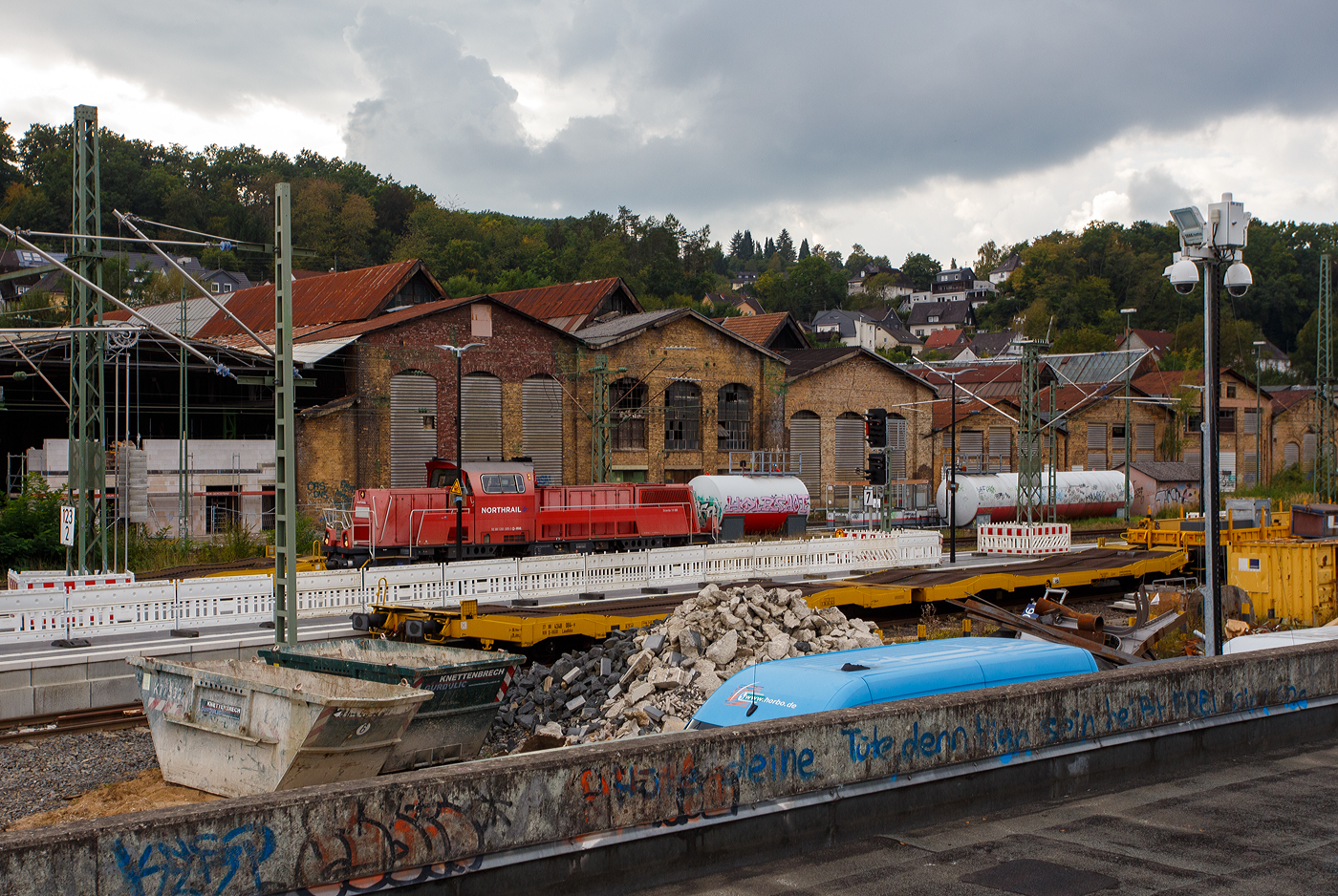 Zwei Voith Gravita 10 BB, die 261 053-3 (92 80 1261 053-3 D-DB) und dahinter die 261 058-2 ( 92 80 1261 058-2 D-DB) der DB Schenker Rail abgestellt am 12.09.2015 beim Bahnhof Montabaur.