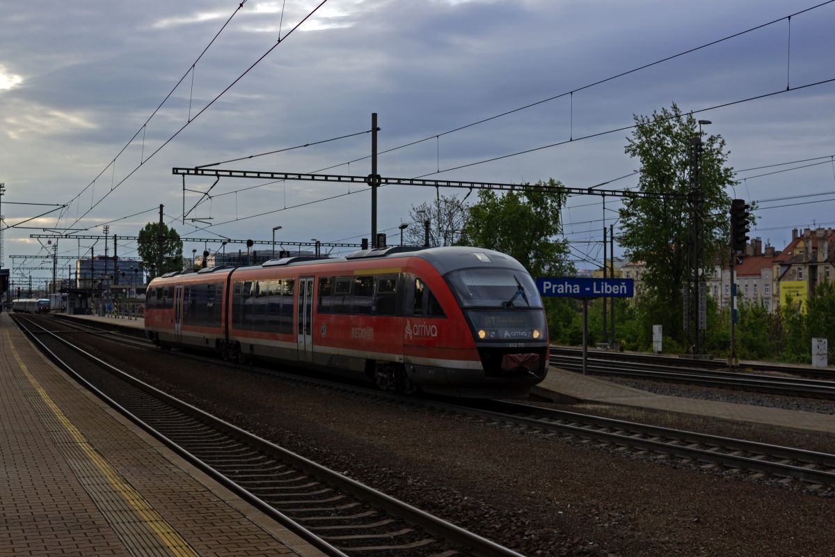 642 086 ist aus Praha-Hostivař zurück und hält auf dem Weg nach Roztok u Prahy gleich in Libeň.