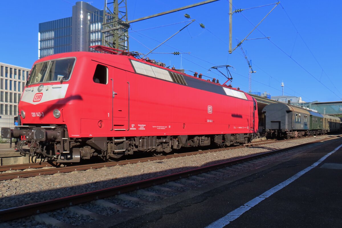 DB: Am 12. Juni 2015 brachte die 120 154-0 den Autozug von Hamburg nach Lörrach. Der Autozug Hamburg-Lörrach kurz nach der Ankunft in Basel Badischer Bahnhof, wo die Reinigung für die Rückfahrt am Abend vorgenommen wird.