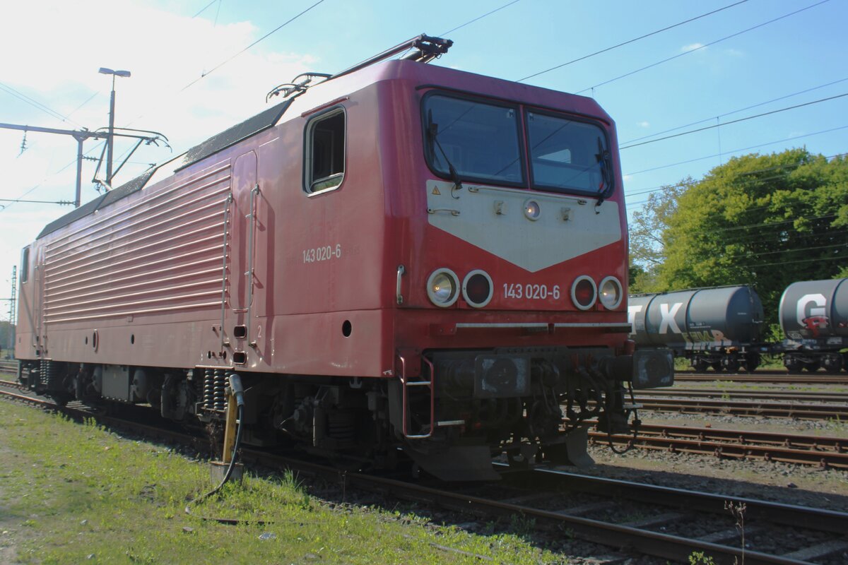 Am 26 April 2025 steht 143 020 in Bad Bentheim -eione Stunde hervor hatte sie ein Kesselwagenzug aus Osnabrück in Bad Bentheim gezogen, welcher von einer RFO 1800 in die Niederlande geschleppt wird.