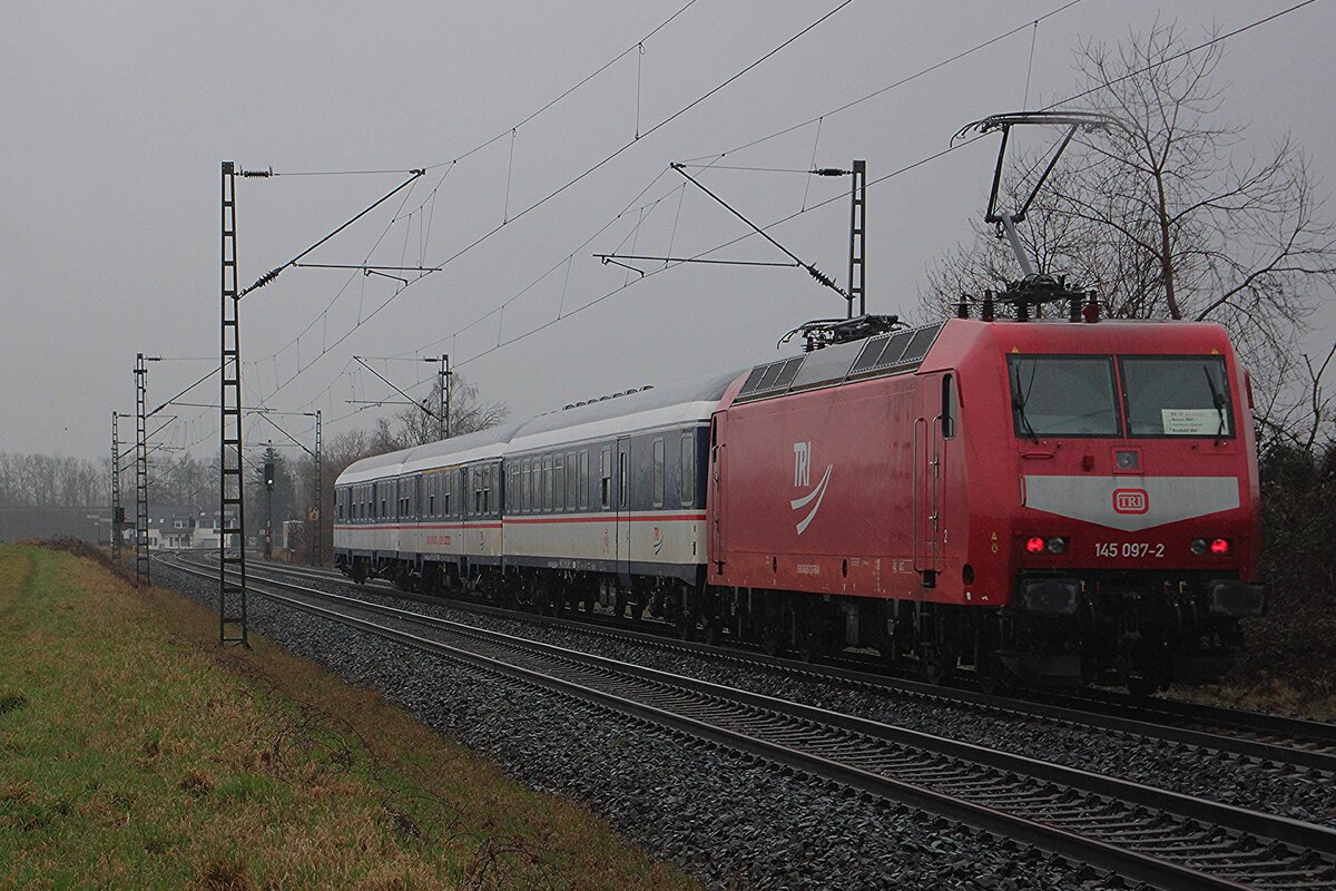 Am verregneten 12 Februar 2026 schiebt TRI 145 097 der RB 37 nach Krefeld Hbf durch Kaarst-Broicherseite und wird vom offenbarer Weg fotografiert. Dieser Himbeerroter Farbgebung ist eine kleiner Witz von TRI; die DB 145er haben diese Farben nie getragen.