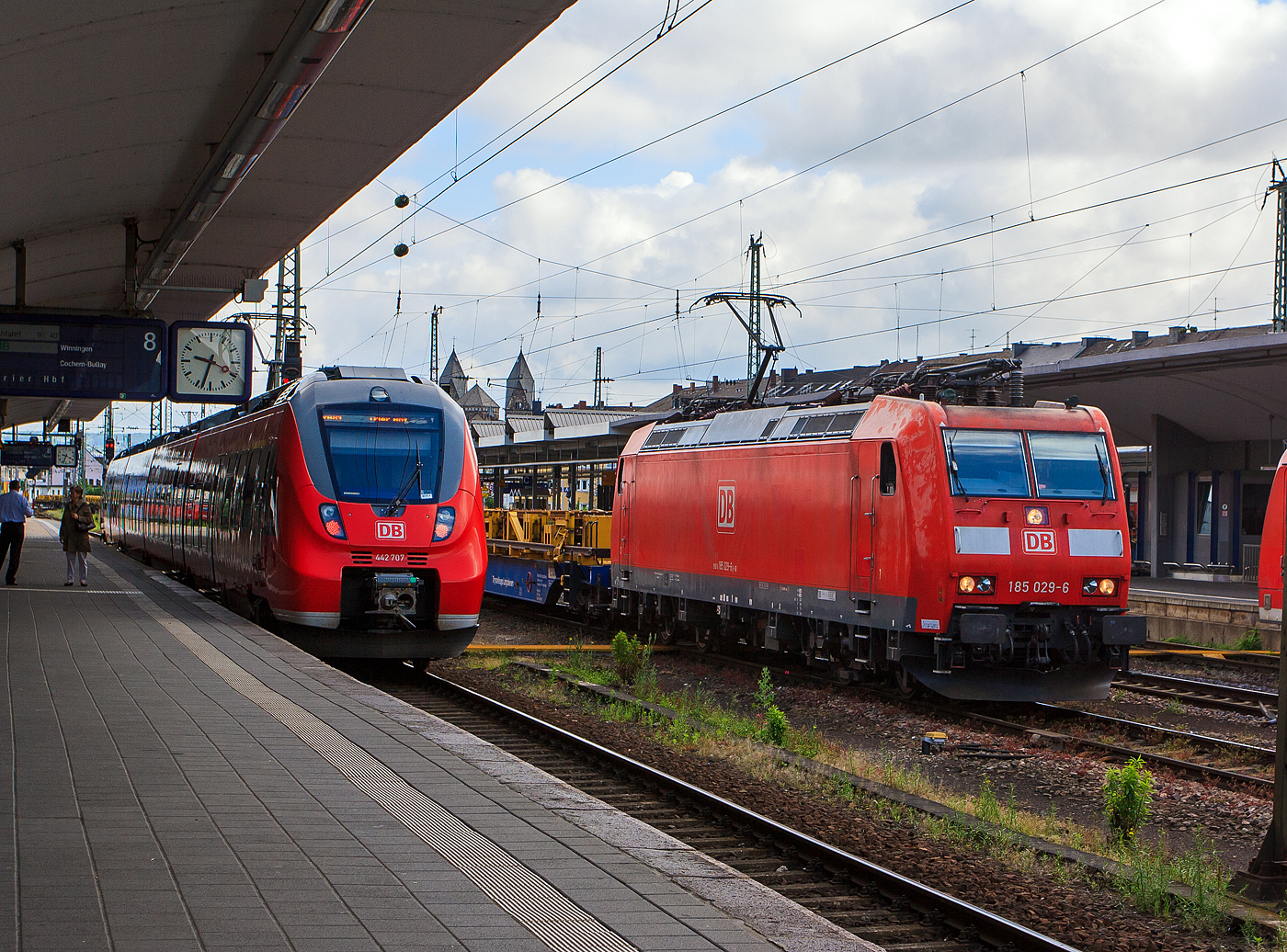 Die 185 029-6 der damaligen DB Schenker Rail (heute DB Cargo AG) fährt am 14 Juni 2013 mit einem ThyssenKrupp Langschienen Zug durch den Hauptbahnhof Koblenz in Richtung Mainz.