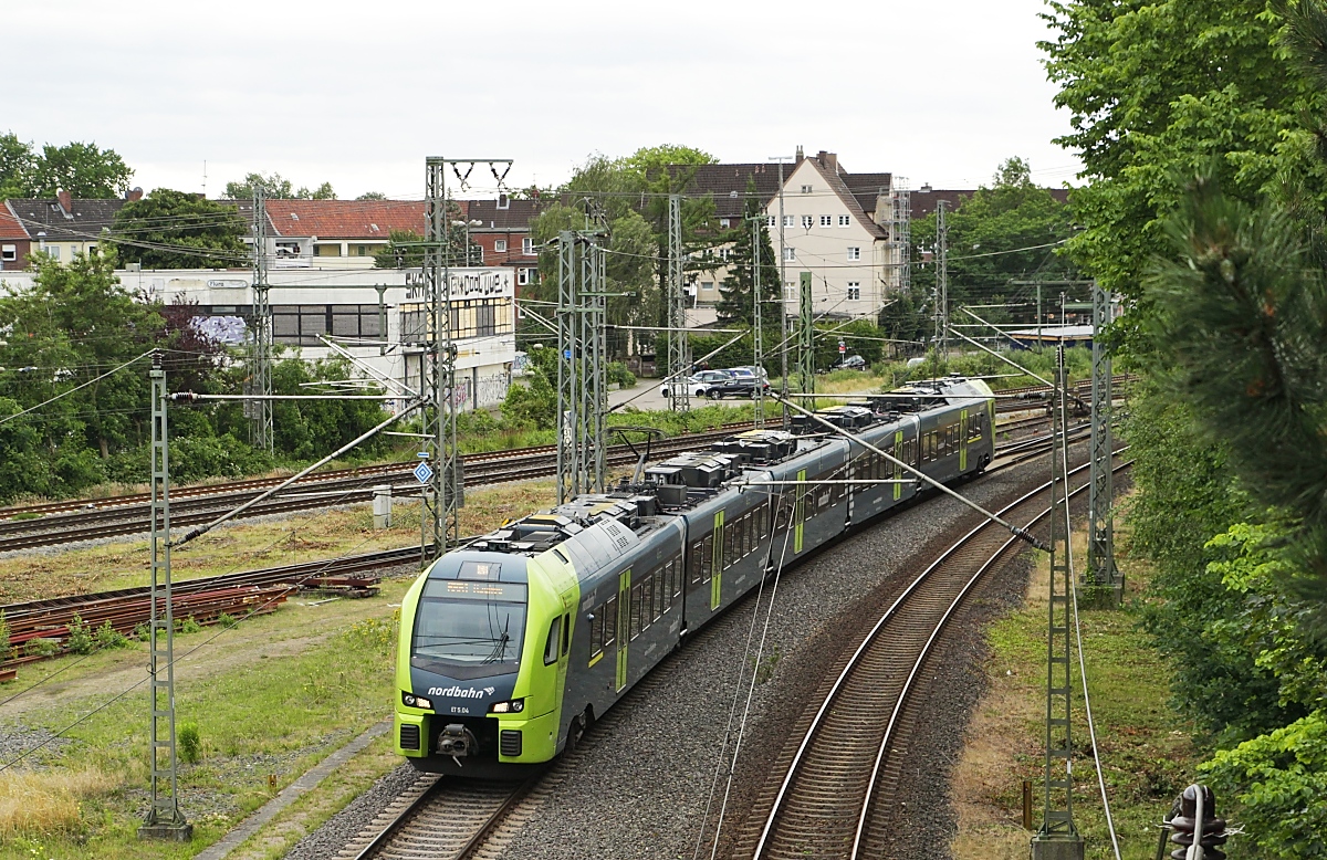 Schaut noch nigelnagelneu aus, Flirt 3 der Nordbahn mit Triebkopf 1 429 506-7 in der altehrwürdigen Hamburger Bahnhofshalle. Juli 2015.