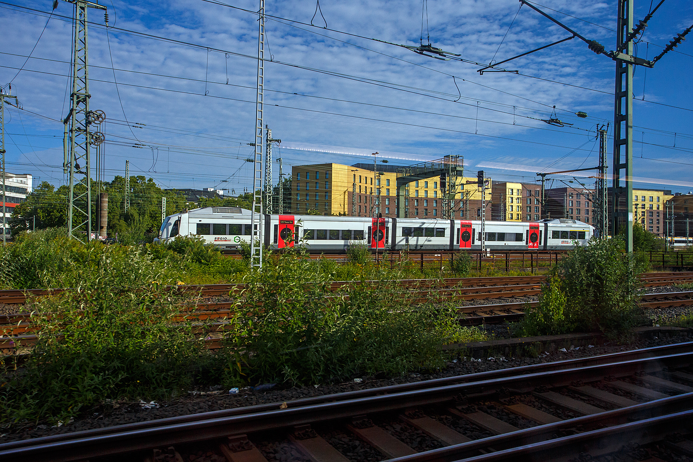 Bei Düsseldorf begegnet unserem IC am 24 Juni 2025 der VT 111 (95 80 0609 111-9 D-REGIO, ein Integral S5D95, der Regiobahn / Regionale Bahngesellschaft Kaarst-Neuss-Düsseldorf-Erkrath-Mettmann-Wuppertal mbH, ex VT 111 „Tegernsee“ Bayerische Oberlandbahn (BOB). Der Integral fährt als S 28 die Verbindung Wuppertal Hbf über Düsseldorf Hbf nach Neuss Hbf und erreicht bald den Hauptbahnhof Düsseldorf.