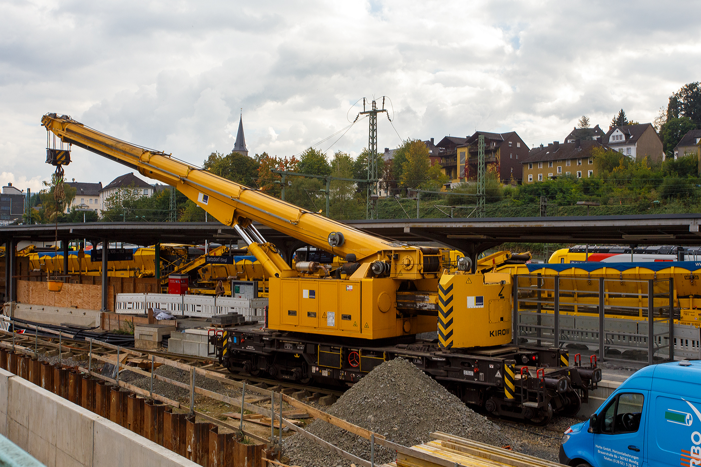 Nun im Einsatz der 125 t KIROW Gleisbauschienenkran KIROW Multi Tasker KRC 810 T (mit Schwerlastausrüstung), Schweres Nebenfahrzeug Nr. D-HGUI 99 80 9419 024-1, ex 97 82 53 513 19-3, der HERING Bahnbau GmbH (Burbach) ist am 29 September 2025 im Betzdorf/Sieg. Hier im Bereich unter dem P+R Parkhaus bis zum Fluss Sieg werden Horizontalbohrungen gemacht, vermutlich für erforderliche Entwässerungs-Leitungen. So mussten Bohrrohre in die Baugrube gehoben werden und wie hier der Abraum aus der Baugrube gehoben werden. Eigentlich ist ein 125 t Kran damit unterfordert (überdimensioniert), aber man muss bedenken es wurde eine weite Auskragung (Ausladung vor Puffer) und das freistehend (Nichtabgestützt) benötigt. Der hier mit der Ausladung vor Puffer von über 15 m könnte der Kran freistehend 30 t heben, aber darf dann nicht schwenken. Wenn geschenkt werden muss liegt diese dann nur bei 1,5 t. Entscheidend für die Ausladung des Auslegers ist aber auch die hintere Ausladung des Gegengewichts. Der Kran wurde 2008 von KIROW in Leipzig unter der Fabriknummer 149000 gebaut und an die HERING Bahnbau GmbH (Burbach) geliefert. Der Gleisbauschienenkran KRC 810 T ist ein Schienendrehkran des Herstellers Kirow Ardelt (bis 2008 Kirow) in Leipzig. Der Typ 810 wird für den Aus-und Einbau von schweren Betonweichen, Gleisjochen und Hilfsbrücken sowie für die Montage von Ingenieurbauwerken eingesetzt. Bei Havarien auf Bahnstrecken leistet er schnelle Hilfe zum Bergen schwerer Lasten. Das maximale Lastmoment des Krans liegt zwischen 500 und 900 tm. Die Krane werden auch als Eisenbahndrehkran „EDK“ bezeichnet. Die maximale Tragfähigkeit des bis zu 128 Tonnen schweren Krans beträgt abgestützt bis zu 125 Tonnen und freistehend 90 Tonnen. Bei maximaler Ausladung kann der Kran noch 28,5 Tonnen heben. Die größte mögliche Hakenhöhe liegt bei 18 m und die maximale Ausladung vor Puffer bei 15 m. Der Teleskoparm erlaubt Arbeiten im Radius zwischen 6,5 und 24,5 Metern. Im Gegensatz zu früheren Kranen ist auch ein Einsatz in der Nullposition ohne Abbau der Fahrleitung möglich. Die Gegenlast (Gegengewicht) ist zum Ausgleich unterschiedlicher Lasten ausfahrbar. Die Gegenlast kann in Transportstellung nicht (wie z.B. bei dem KRC 910) auf einem Gegenlastwagen abgestützt werden. Dadurch hat KRC 810 auch eine höhere Streckenlast (als z.B. der KRC 910). Für Hebearbeiten instehender Stellung verfügt der Kran über hydraulisch-ausfahrbare Stützen. Die Höchstgeschwindigkeit 19 km/h mit dem Eigenantrieb und 120 km/h im Zugverband geschleppt. Zu dem Kran gehören zwei Kranschutzwagen. Die zulässige Anhängelast beträgt 80 t. TECHNISCHE DATEN: Spurweite: 1.435 mm (Normalspur) Anzahl der Achsen: 8 Achsfolge: [(1A)(1A)][(A1)(A1)] Länge über Puffer: 13.000 mm (ohne Ausleger) Drehzapfenabstand: 8.000 mm Drehzapfenabstand im Drehgestell 1 und 2: 2.300 mm Achsabstand in den Einzeldrehgestellen: 1.100 mm Ergebene Achsabstände in m: 1,1 / 1,2 / 1,1/ 4,6 / 1,1 / 1,2 / 1,1 Treib- und Laufraddurchmesser: 730 mm (neu) / 680 mm (abgenutzt) Höhe in Transportstellung: 4.250 mm Breite in Transportstellung: 3.100 mm Eigengewicht: 128 t Dieselmotor: Wassergekühlter 6-Zylinder Reihenmotor mit Abgasturboaufladung und Ladeluftkühlung vom Typ Cummins M 11 – C 315 Motorleistung: 235 kW bei 1.800 U/min Max. Drehmoment: 1.458 Nm bei 1.300 U/min Not-Dieselmotor: Luftgekühlter 2-Zylinder Viertakt-Dieselmotor mit Direkt-Einspritzung vom Typ Hatz 2 G 40 mit einer Leistung11,5 kW bei 2.300 U/min. Fahrgeschwindigkeit im Zugverband: 120 km/h (geschleppt) Fahrgeschwindigkeit mit Eigenantrieb: 20 km/h zul. Anhängelast: 80 t Hakenhöhe (max.): 18 m Ausladung (max. vor Puffer): 16 m Zugelassen als Schwerwagen für Streckenklasse: CS 05 Maximale Radsatzlast: 16 t Streckenlast (Meterlast): 9,9 t/m kleinster befahrbarer Radius: 00 m Bremse: KE-GP-D- m.Z. (Scheibenbremsen auf allen Rädern) Sekundär Scheibenbremsen auf allen Rädern Handbremse: hydro-mechanisch auf alle Radsätze Kraftstoffvorrat: 990 l Tragfähigkeiten: bei 0,00 m Ausladung vor Puffer, mit Schwerlastausrüstung: 125 t bei 2,80 m Ausladung vor Puffer, ± 30°, abgestützt: 90 t bei 2,80 m Ausladung vor Puffer, ± 20°, freistehend: 46 t