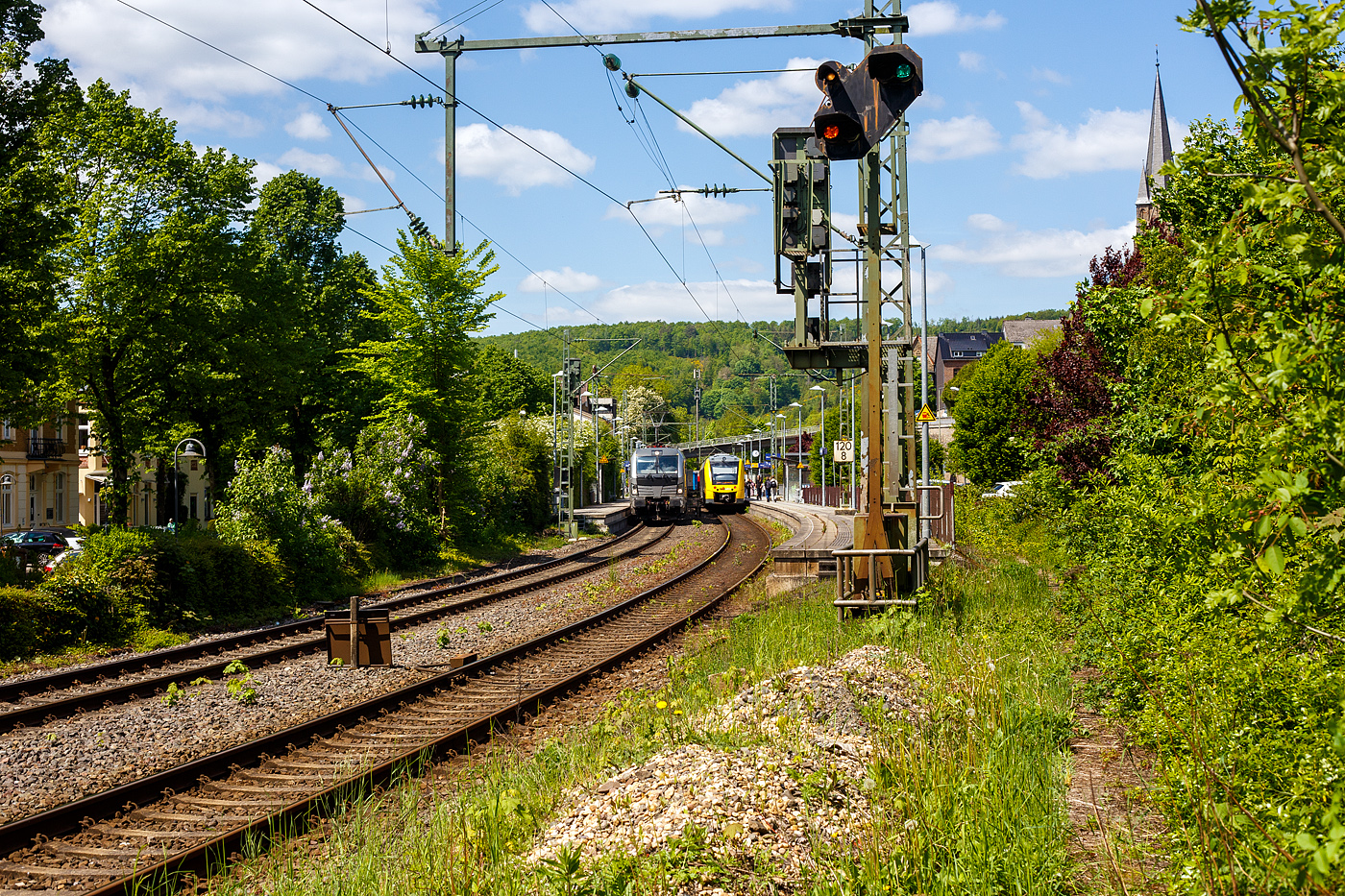 Bahnhof Kirchen an der Sieg am 06 Mai 2025: Rechts auf Gleis 2 hält der HLB VT 504 (95 80 1648 104-5 D-HEB / 95 80 1648 604-4 D-HEB), als RB 93 "Rothaarbahn" von Betzdorf nach Erndtebrück. Links auf Gleis 1 fährt die 193 921 (91 80 6193 921-4 D-NRAIL) der Northrail GmbH mit einem KLV-Zug (Taschenwagenzug) durch den Bahnhof in Richtung Köln. Nochmals einen lieben Gruß an den netten Lokführer zurück.