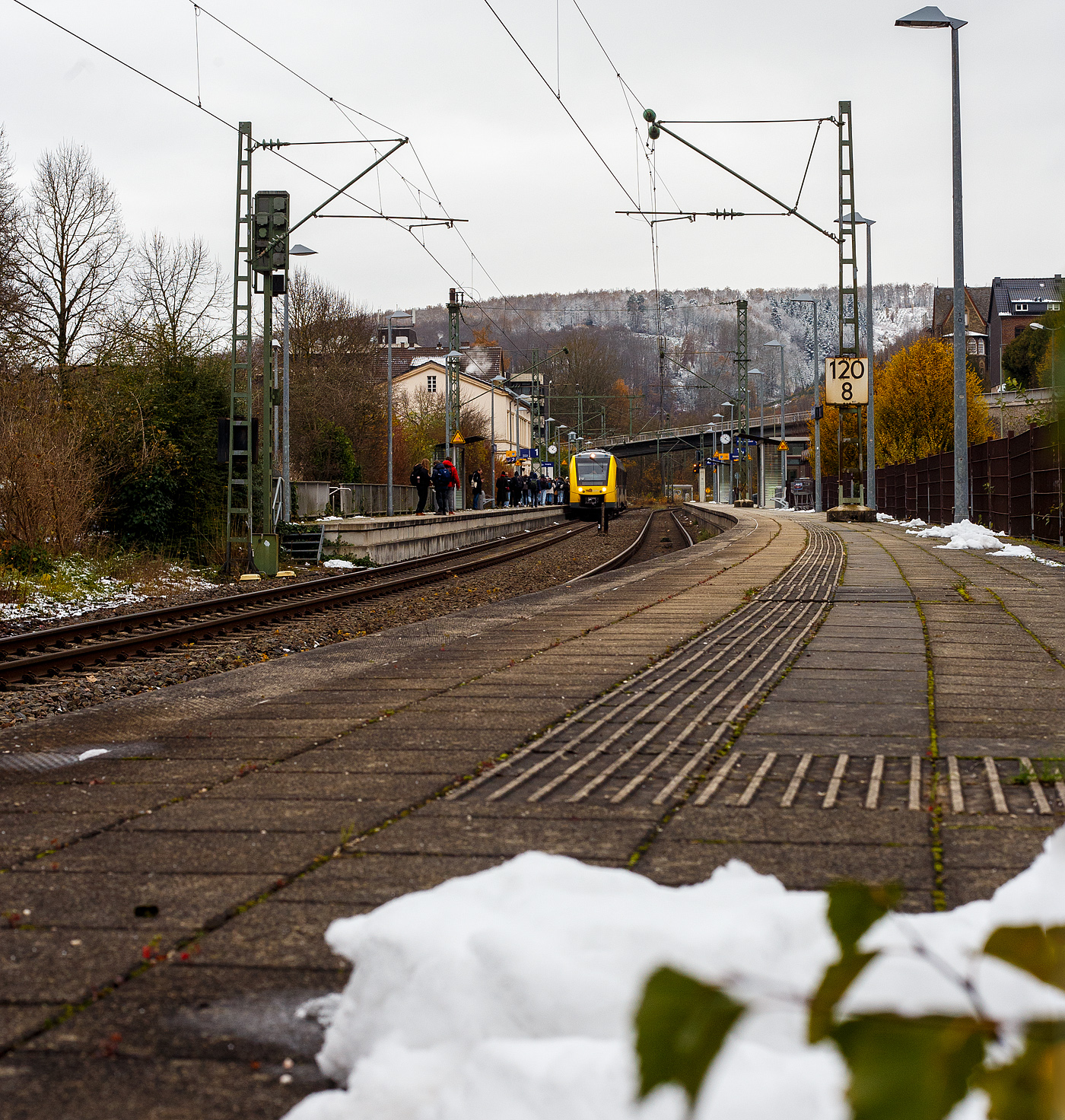 Der VT 507 (95 80 1648 107-8 D-HEB / 95 80 1648 607-7 D-HEB), ein Alstom Coradia LINT 41 der neuen Generation der HLB (Hessische Landesbahn GmbH), als RB 93 "Rothaarbahn" (Bad Berleburg - Kreuztal - Siegen – Betzdorf), am 22 November 2024 beim Halt im Bahnhof Kirchen/Sieg.