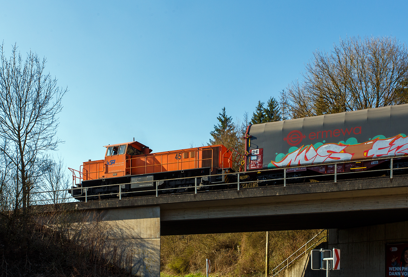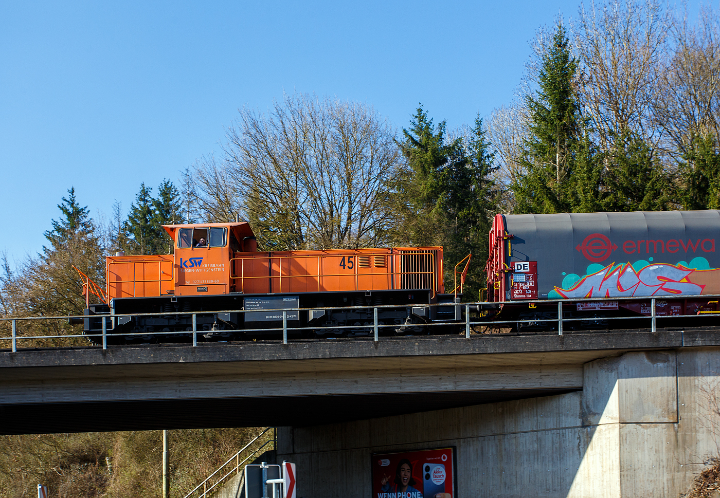 Geführt von der KSW 42 (92 80 1277 902-3 D-KSW), eine Vossloh MaK G 1700 BB, fährt am 19 März 2025 die KSW (Kreisbahn Siegen-Wittgenstein), im Sandwich mit einem schweren Coilzug, von Betzdorf/Sieg in Richtung Herdorf zum KSW-Rangierbahnhof (Betriebsstätte FGE - Freien Grunder Eisenbahn), hier bei Herdorf-Sassenroth. Am Zugschluss die nachschiebende KSW 45 (98 80 0276 016-9 D-KSW) eine MaK G 1204 BB.