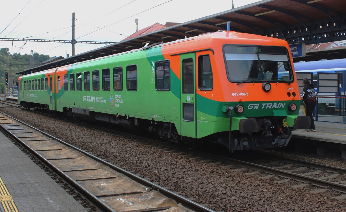 Der DUEWAG RegioSprinter 654 045-3 (95 80 0654 045-3 D-GWTR) der GW Train Regio a.s., ex VT 45 der Die Länderbahn, steht am 20.04.2023, beim Lokschuppen beim Bahnhof Becov nad Teplou(Petschau).