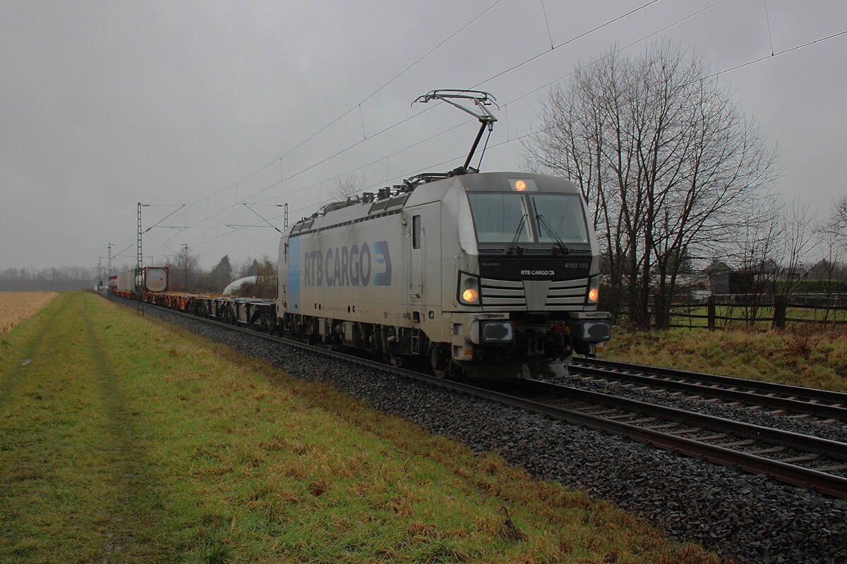 Die an die RTB Cargo vermietete Siemens Vectron MS - 6193 945-3 (91 80 6193 945-3 D-ELOC) der ELL - European Locomotive Leasing (Wien) fährt am 30 Januar 2026 mit einem Containerzug durch Eiserfeld in Richtung Siegen. Im Hintergrund die 105 m hohe Siegtalbrücke der A45 (Sauerlandlinie). Die SIEMENS Vectron MS - 6.4 MW wurde 2022 von Siemens in München-Allach unter der Fabriknummer 22989 gebaut. Sie ist in der Variante A10-7i ausgeführt und hat so die Zulassungen für Deutschland, Österreich, Polen, Tschechien, Slowakei, Ungarn, Niederlande und Rumänien (D / A / PL / CZ / SK / H / NL und RO). So besitzt die Variante MS A10 folgende Zugsicherungssysteme: ETCS BaseLine 3, sowie für Deutschland (PZB90 / LZB80 (CIR-ELKE I)), für Österreich (ETCS Level 1 mit Euroloop, ETCS Level 2, PZB90 / LZB80), für Polen (SHP), für Tschechien und die Slowakei (LS (Mirel)), für Ungarn (ETCS Level 1, EVM (Mirel)) für die Niederlande (ETCS Level 1, ETCS Level 2, ATB-EGvV) und für Rumänien (PZB90).