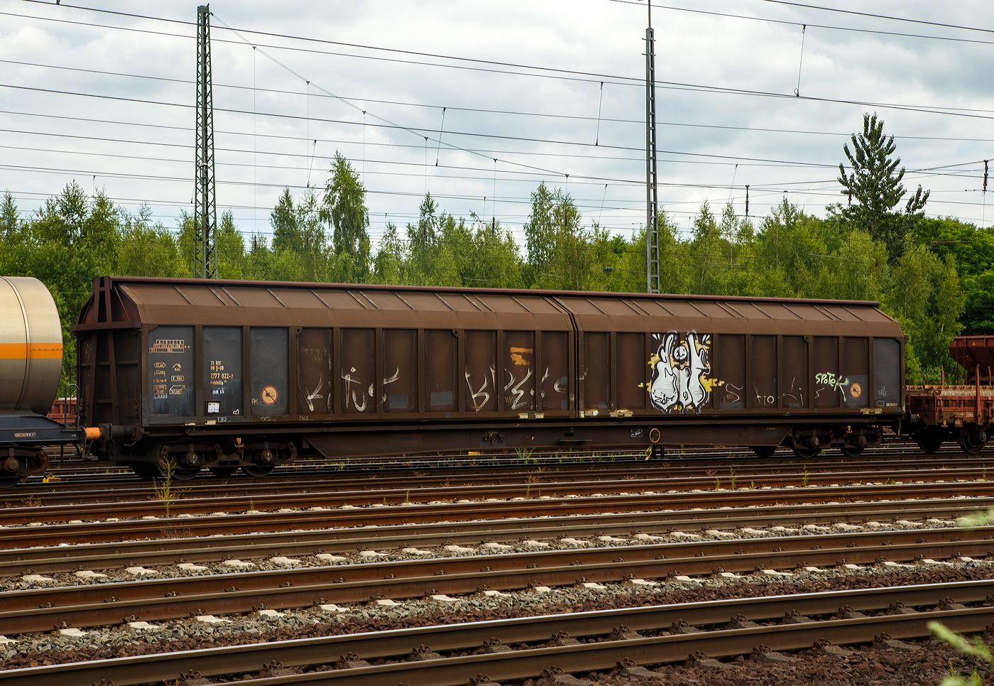 2 x zweiachsige, zweigliedrige, festgekuppelte, gedeckte Güterwageneinheit mit Schiebewänden, 23 80 2941 220-8 D-TWA der Gattung Hiirrs der TRANSWAGGON GmbH (Hamburg) am 04 Juli 2023 im Zugverband, eingereiht in den sogenannten "Henkelzug", bei der Zugdurchfahrt im Bf Kirchen (Sieg). Leider sind solche Wagen immer sehr beschmiert.