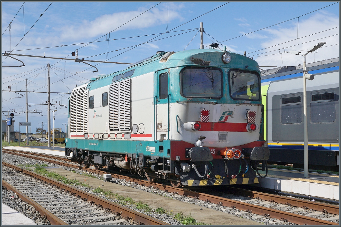 Diesellok 245 705-8 (98 83 2245 705-8 I-TI) rangiert in der Abstellung im Bahnhof Bozen mit einem Triebzug ETR 170. 15.05.2019 (Hans)