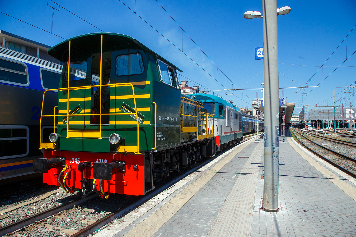 Die Diesellos D.345 1010 (92 83 2345 010-8 I-TI) mit der wohl frisch aus der Revision kommenden D.245 6118 (98 83 2245 718-1 I-TI) am Haken, beide der Trenitalia (100-prozentige Tochtergesellschaft der FS), am 14 Juli 2022 im Bahnhof Roma Termini. Für einen Gleiswechsel musste das Gespann in den Bahnhof rangieren.