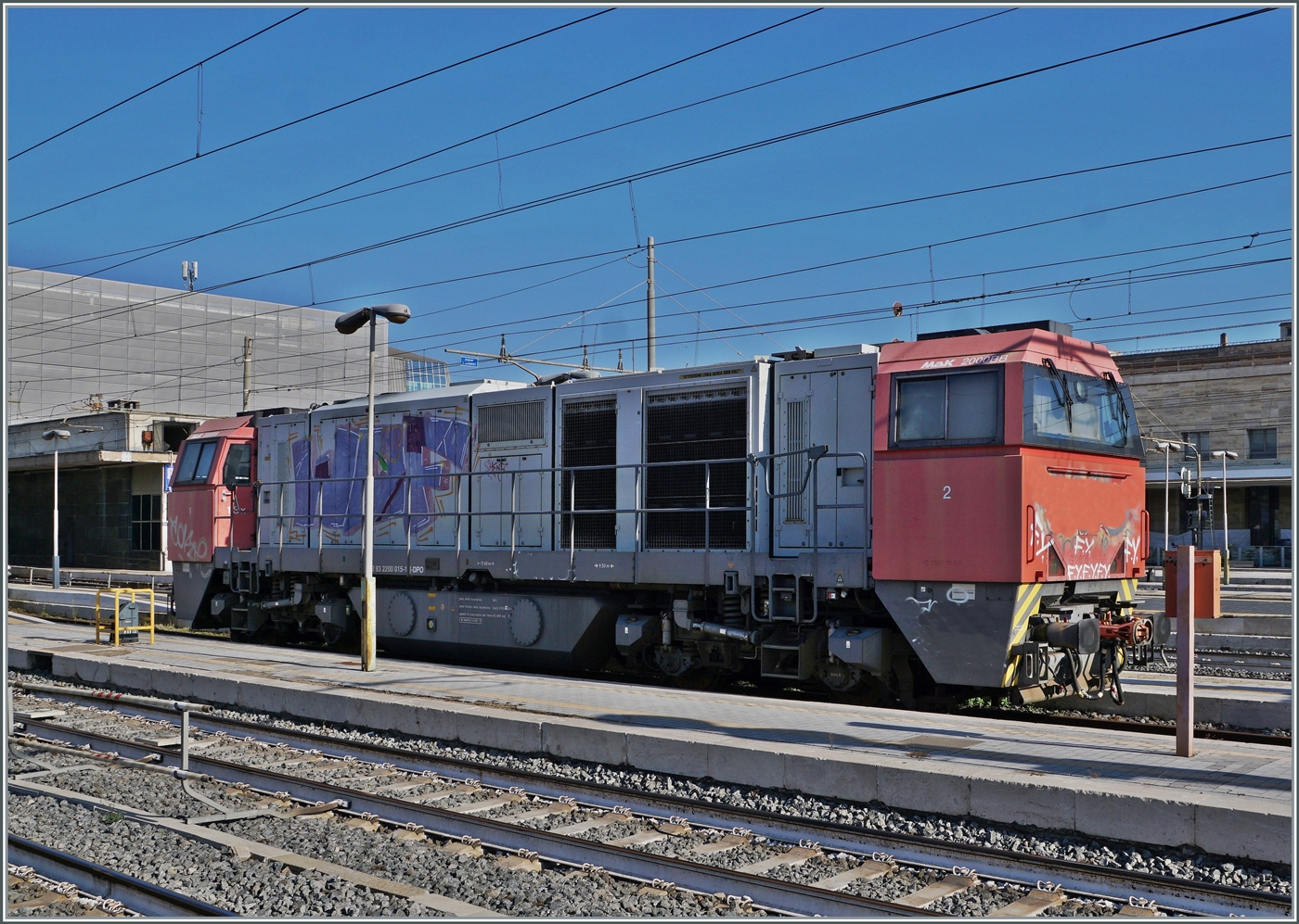 Von der Dinazzano Pò (DPO) Eurolight D 284 002 (UIC 92 83 2284 002-8 I-DPO) geschoben, wird die D 744 006 (UIC 92 83 2744 006-3 IT-DPO) in Reggio Emilia rangiert.