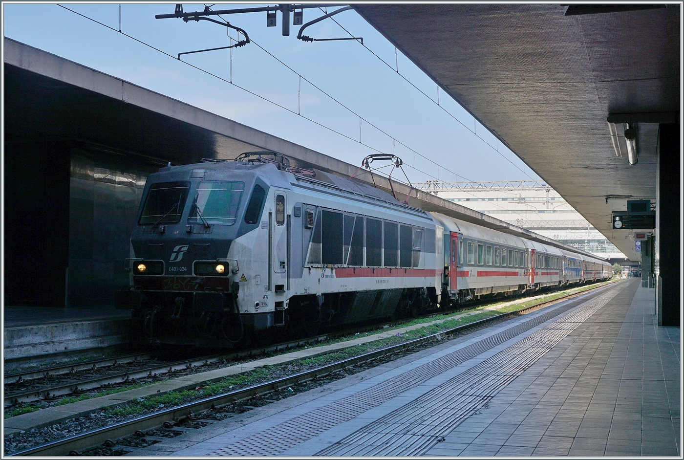 Die E 402.105 (91 83 2402 105-7 I-TI) eine E.402 B der Trenitalia (in grün-weißer Lackierung) steht am 23.07.2022 mit einem Trenitalia InterCity (IC) im Bahnhof Genova Piazza Principe. Am Zugschluss war eine weitere E.402 B.