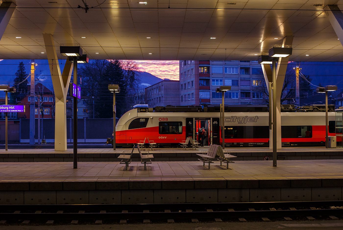 Salzburg Hauptbahnhof am 15 Januar 2025, nun schneit es leicht, die letzten Passagiere sind aus dem ÖBB-Railjet von Wien Hbf. ausgestiegen und die ÖBB-Railjet 1116 236 (A-ÖBB 91 81 1116 236-1) schiebt/drückt nun den Zug in die Abstellgruppe.