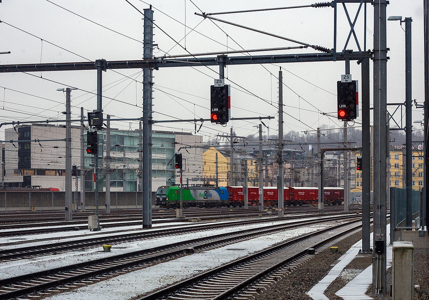 Die an die FRACHTbahn Traktion GmbH (Wien) vermietete Siemens Vectron AC 193 230 „Josef“ (91 80 6193 230-0 D-ELOC) der European Locomotive Leasing, mit Werbung für die „Forstservice Klade Group“ fährt am 27.04.2022 mit einem KLV-Zug durch Kirchen (Sieg) in Richtung Köln.