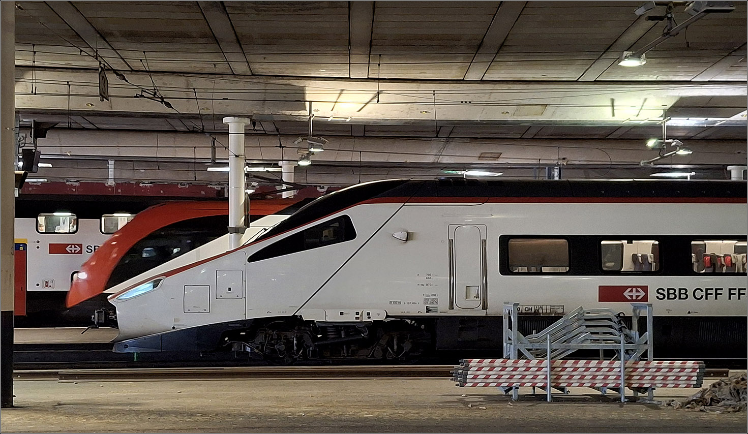 Der Bahnhof Bern - Hinterer Steuerwagen eines HGV-Zuges der Baureihe RABe 503 im Bahnhof Bern. 07.03.2025