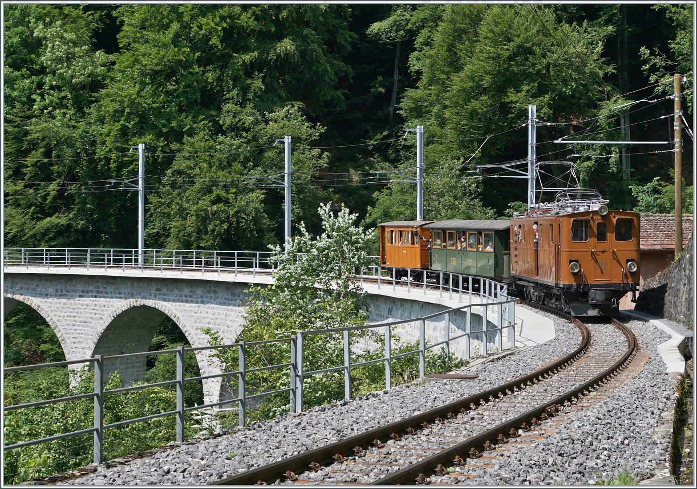 Festival Suisse de la vapeur (Schweizer Dampffestival 2025) - Soweit ich unterrichtet war, hätte dieser Zug mit der LEB G 3/3 N° 5 verkehren sollen; zudem erlitt der Raddampfer  La Suisse  einen Schaden, welcher dem Dampfschiff einen längeren Werftaufenthalt beschert - in diesem Falle eine eher wenig erfreuliches Ereignisse  zum Dampf-Geschehn in der Region. Aber ich freute mich natürlich sehr, die wunderschöne RhB Bernina Bahn Ge 4/4 81 der Blonay Chamby Bahn bei gutem Licht auf dem sanierten Baye de Clarens Viadukt fotografieren zu können.
