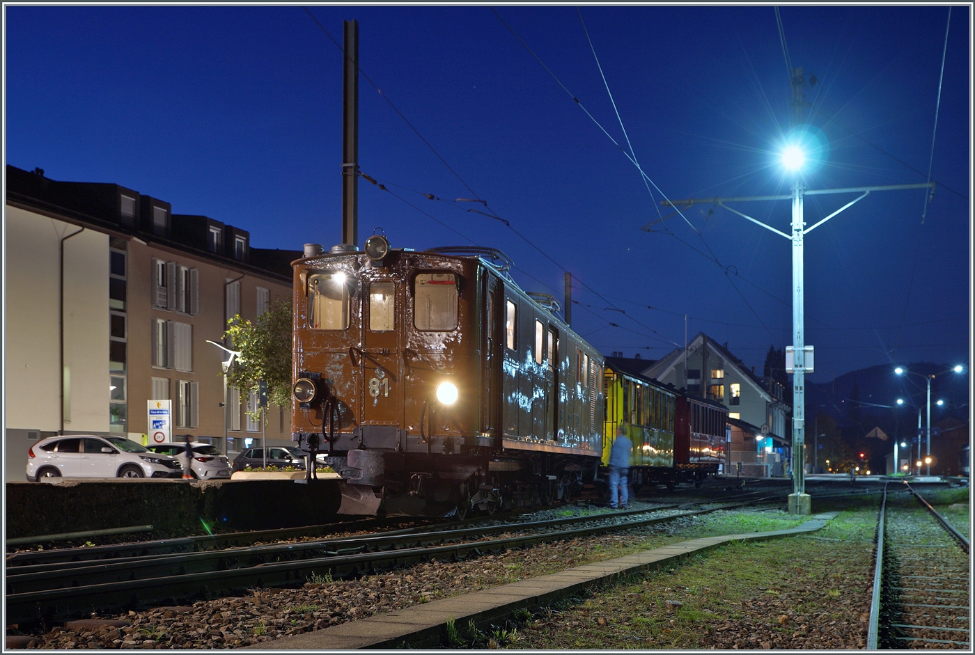 La DER de la Saison 2024 / Das Saison Ende 2024 der Blonay-Chamby Bahn - Der Schluss vom Ende: Dank der Zeit-Umstellung verkehrt der aller letzte Zug der Saison in der blauen Stunde. Die Bernina Bahn RhB Ge 4/4 81 der Blonay Chamby Bahn brachte den letzten Zug nach Blonay und wartet nun mit dem Leermaterialzug auf die Rückfahrt nach Chaulin. Somit ist die Saison 2024 endgültig vorbei - was bleibt sind viele schöne Erinnerungen und Fotos, und natürlich ein grosses Danke-Schön an die freiwilligen Mitarbeiter der Blonay Chamby Bahn für die einmal mehr sehr gelungene Saison!