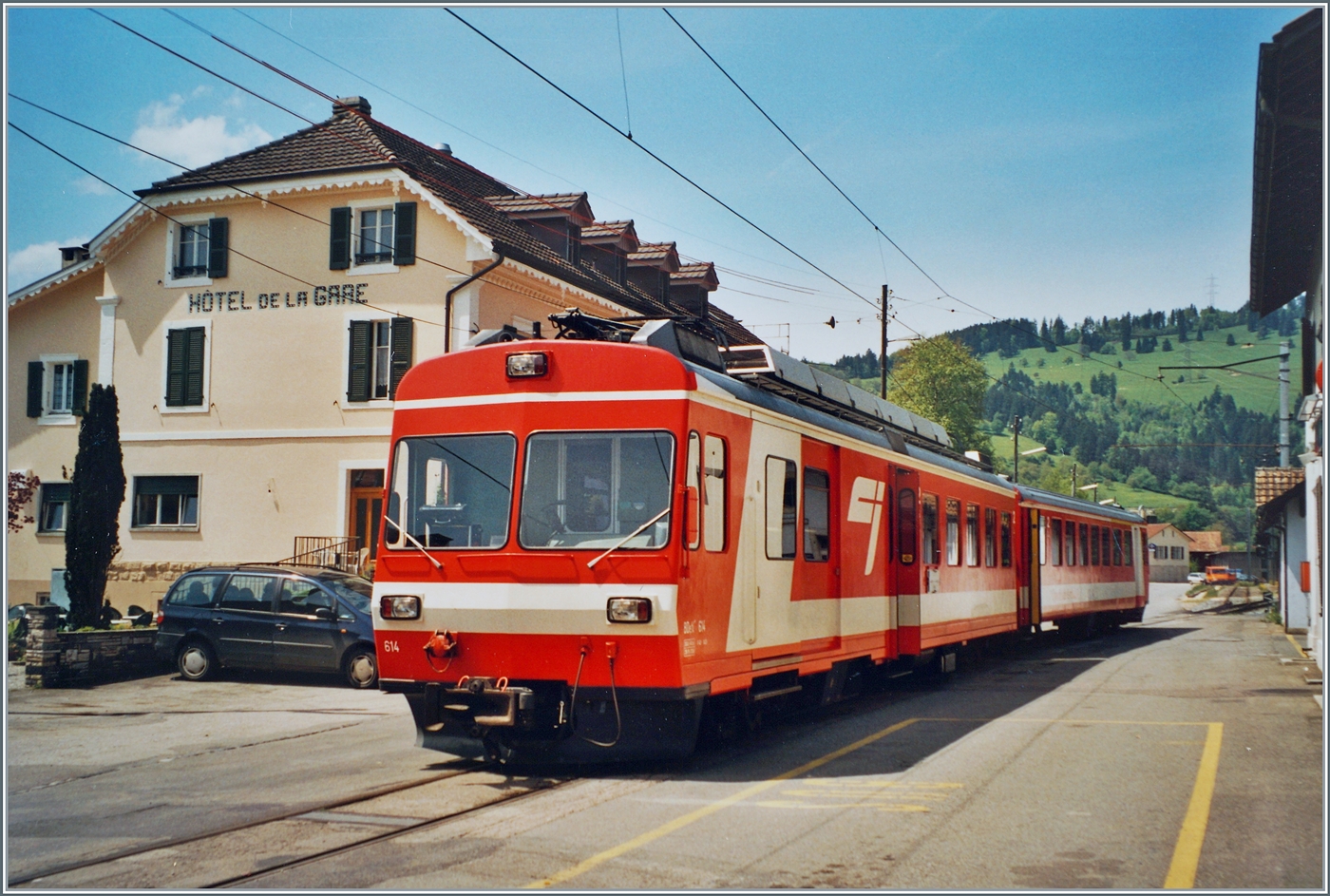 Gut zwanzig Jahre später hat sich das Bild kaum verändert, weiterhin enden und beginnen die CJ Züge mitten auf der Strasse direkt vor dem SBB Bahnhof von Glovelier. Im Bild der CJ BDe 4/4 614 mit Bt nach der hier für die Rückfahrt nach Saignelégier wendet. Analogbild vom Mai 2001