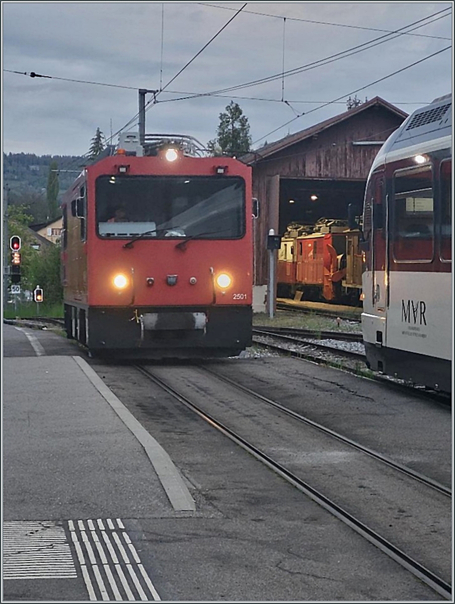 Leider nur in schlechter Handy Qualität: Während im Morgengrauen im linken Bildteil die MOB HGem 2/2 2501 (ex MVR) rangiert, sind in Dépôt die beiden CEV He 2/2 Nr. 1 und 2 zu erkennen. Die Aufnahme entstand in Blonay. 23. April 2025