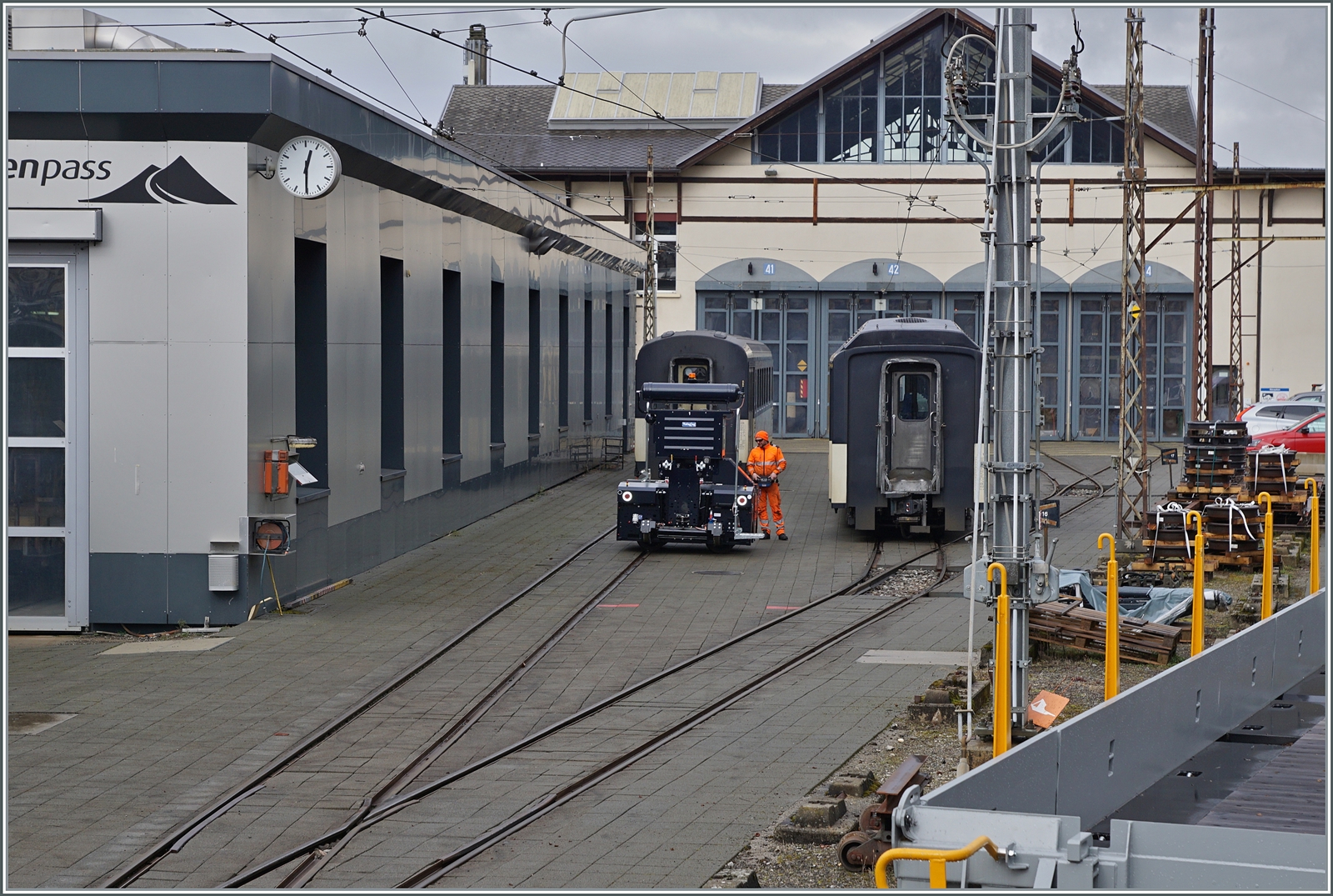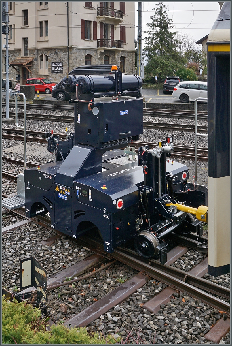 Der neue ZAGRO E-MAXI (mit Batterieantrieb) rangiert in Chernex im Bereich des Atelier der MOB einen Panorama Wagen.