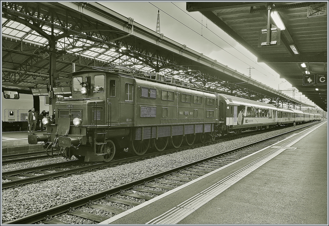 In Lausanne auf Gleis 1 wartet die SBB Historique Ae 4/7 10976 mit ihrem SBB Schulzug (hier nicht zu sehen) auf die Weiterfahrt.