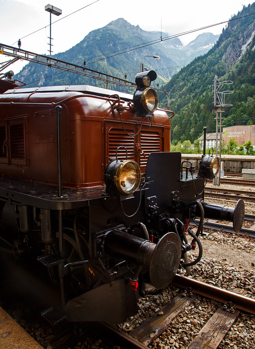 Frontpartie von dem SBB Gotthard Krokodil Be 6/8 II 13253) der SBB Historic am 02 August 2019 im Bahnhof Göschenen.