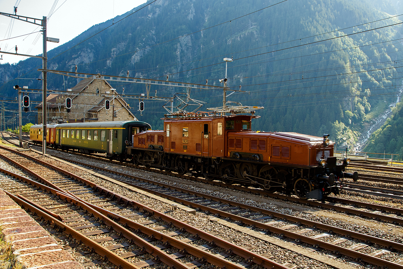 Am 19 September 2019 steht 14253 ins verregneten Erstfekld während die Erstausgabe (und hoffentlich nicht der Letztausgabe) des Bahnhofsfests  Bahnen am Gotthard  -mit jeden Stunde ein Sonderzug zwischen Erstfeld und Göschenen.