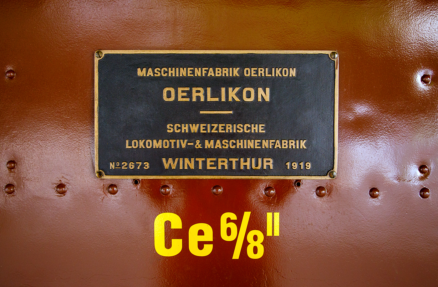 Fabrikschild von dem  SBB Gotthard Krokodil Ce 6/8 II 14253 (eigentlich Be 6/8 II 13253) der SBB Historic am 02 August 2019 im Bahnhof Göschenen.