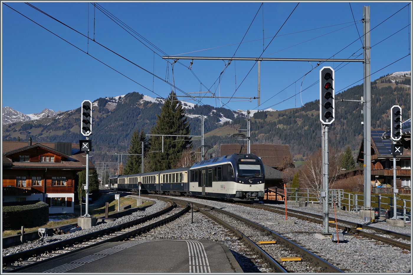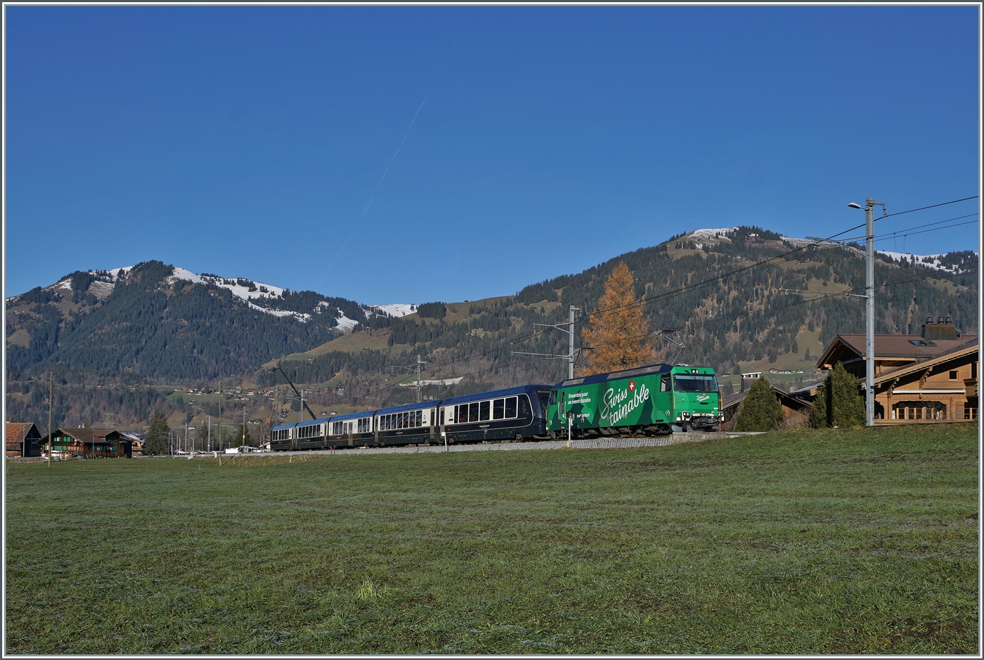 Die MOB GDe 4/4 6006 mit ihrem Panoramic Express kreuzt in Chamby ihren Gegenzug, der schon fast hinter dem Panoramic Express verschwindet.