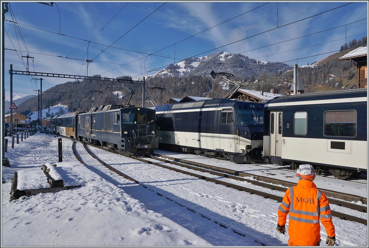 Die letzte Fahrt eines "MOB" Panoramic Express - die MOB GDe 4/4 6006 brachte zwei Panoramia wagen in Vevey, die hier für den Transport nach Frankreich vorbereitet werden.